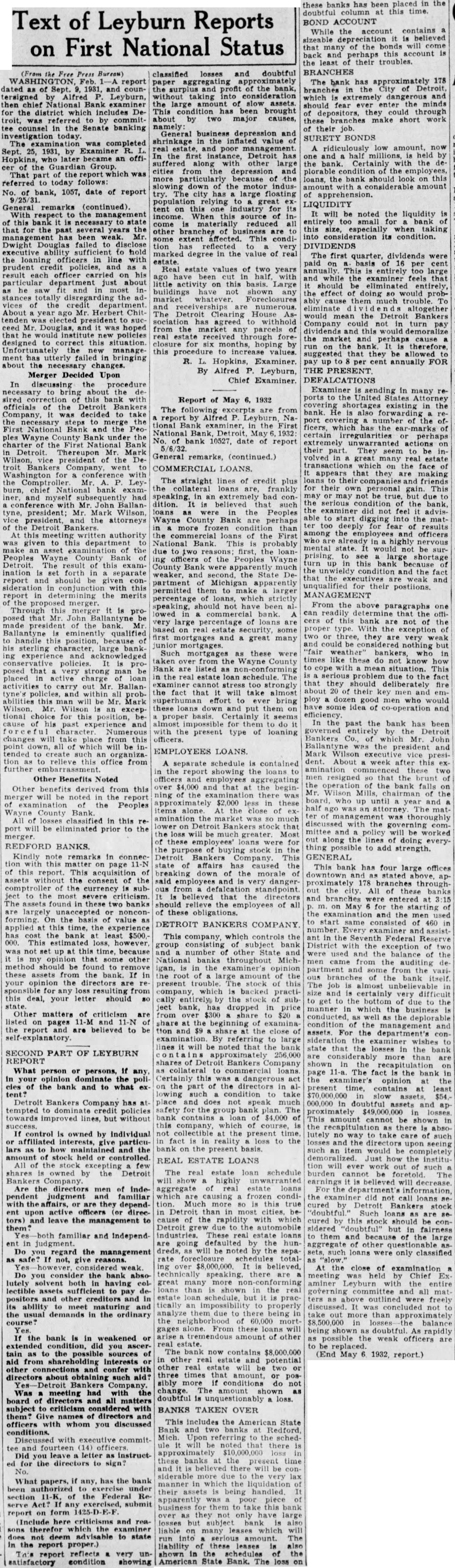 Text of Leyburn Reports on First National Status the Free Press Bureau) report 1931, and countersigned Leyburn, chief National examiner the district which includes committee counsel in the Senate banking investigation today. completed Sept. 25, 1931, by who an offiGroup. That part the report today follows: No. of bank, 1057, date of report General remarks (continued). With the this necessary for the past several years been Mr. Dwight failed hold the loaning line with prudent policies, result officer carried his particular department just about he and most the vices About Mr. Herbert tenden ceed Douglas, and hoped he institute new policies designed to correct this situation management failed bringing about the Merger Decided Upon In the sired this officials the Detroit Bankers Company, decided take the steps merge First National Bank the Wayne Bank under the Bank Mark president the Detroit for with the Mr. burn, chief National bank and Ballantyne Mr. Mark Wilson, the attorneys Detroit At this department asset examination of the Peoples County Detroit. The result this ination forth report should given this report the merits merger. Through this merger it is proposed made the Ballantyne qualified handle position, because sterling large ing acknowledged conservative policies. posed that strong be placed out Ballanprobabilities this will be Mr. Mark Wilson. Wilson exceptional choice for his experience and character Numerous changes place from which will tended office from further Other Noted Other from this noted the report examination Peoples County Bank. All classified in this port will be eliminated prior to merger. REDFORD BANKS. Kindly note remarks in connecmatter page this This assets without the consent the comptroller the currency subsevere assets banks nonconforming value applied bank not this because that other method should found these assets the bank. If your are this deal, letter should Other matters of criticism are listed the report are believed to SECOND PART OF LEYBURN REPORT What person or persons, If any opinion the of the bank to what Detroit Bankers Company tempted credit policies towards but without control owned by individual affiliated particuto and the amount of stock held the shares owned the Detroit Company. directors men of judgment and familiar dependupon active (or direcand leave the management to familiar and independ. ent in judgment. Do regard the management not, reasons. weak Do you the bank absolutely both collectible pay and creditors in its ability the usual demands in the ordinary bank is in weakened or condition, did as sources of shareholding other confer about obtaining such aid? Bankers Company. Was meeting the board directors all matters subject criticism considered them? names directors and officers whom you discussed conditions. with executive commitDid you as the directors papers, if any, has the bank authorized under section of the Federal serve Act? any submit report on form (Include here criticisms and examiner to state the report proper.) report reflects very satisfactory condition showing classified losses and doubtful aggregating profit the taking the of slow assets. has been brought about two major causes, namely: General business and the Detroit suffered along with other large cities from depression particularly the the motor indusfloating tent on for its income. When source come reduced other branches extent affected. This condithe value of real estate. Real estate values of two years on this basis. buildings shown Foreclosures and numerous. Detroit House has from the real received six hoping by this increase values. R. Hopkins, Examiner. By Alfred Leyburn, Chief Examiner Report May 1932 The are from Alfred tional the National Bank, Detroit, 1932 bank 10527, date of report 5/6/32. General remarks, (continued.) COMMERCIAL LOANS. The straight lines of credit plus frankly bad dition. such loans Peoples Wayne County Bank perhaps more than loans of the First National Bank. This probably due first, loanthe Peoples Wayne County much weaker, and second, the partment Michigan permitted larger percentage which strictly speaking, not been lowed commercial bank. loans some first mortgages and great many mortgages. Such mortgages these were the Wayne County are listed estate loan schedule. examiner strongly that superhuman bring loans and put them proper Certainly seems almost for them the present type of loaning officers. EMPLOYEES LOANS. separate schedule contained report showing the officers $4,000 and that begin$2,000 these items At the close amination the much Bankers the loss will Most for the in the Company state affairs caused the the and ous from defalcation standpoint believed should employees of all these obligations. DETROIT BANKERS COMPANY This company, consisting other banks throughout Mich the opinion amount of the present stock this backed practisub dropped in $20 close referring to large will the 256,000 shares Detroit Bankers Company collateral commercial loans dangerous act the directors take and speak safety bank $4,000 this company, which collectible present time. fact reality loss to the bank on the present basis. REAL ESTATE LOANS The real estate loan schedule highly estate loans which frozen condithis true because the rapidity with which Detroit due automobile industries. These estate loans going defaulted by the hunthe separate $8,000,000 speaking, there great the estate loan practically to properly analyze them there 60,000 mortalone. From these amount of other bank $8,000,000 potential other two three times that amount, possibly more conditions not change. amount shown doubtful is unquestionably loss. BANKS TAKEN OVER This Includes the State Bank Mich. Upon the schednoted that $10,000,000 these banks the and believed will be considerable the manner their being was business for them bank over large losses but subject bank liable many leases which will run into serious amount. The liability these leases shown schedules of the 