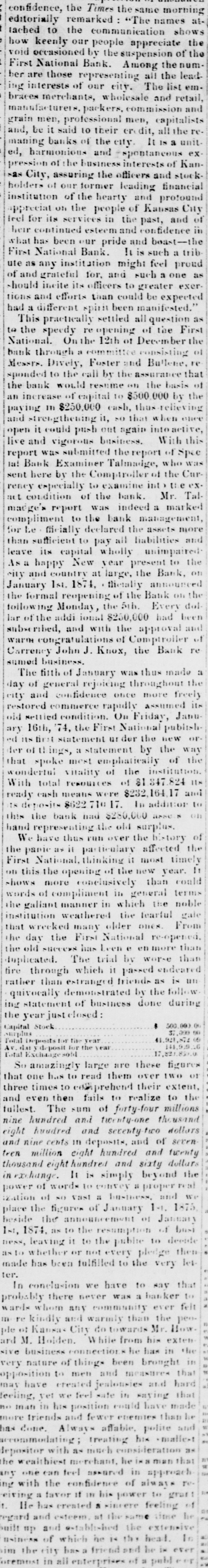 KANSAS CITY. CAUSES OF THE SUSPENSION OF THE FIRST NATIONAL BANK-HOW IT WILL AFFECT THE TRADE OF THE KAW VALLEY. From the Kansas City Times, Nov. 25. To those who know anything about Kansas City and the mon who have labored most to build up this city, the suspension of such a banking-house as the First National impllos more than the more failure of the bank to meet calls upon it by its depositors. It indicates a loss of confidence in a corporation formed by & combination of fifteen of the soundest fluancial business men in the West-such men au Michael Dively, Kersoy Coats, William St. Clair, Edward H. Allen, Thomas K. Hanna, John D. Baucroft, M. W. St. Clair, Howard M. Holden, Adain Long, T. B. Bullene, Matt Foster, J. A. Bachman, 0. Chanute, Francis Foster, and J. N. Packard. These are the class of men who have plodged their all to indomnify the depositors in this bank. These gentlemen are known to this community as identified in this city with nearly all important public or business enterprises known to our people. The more fuot of their identification with this bank should silence the clainor now raised by the uninformed, and, in a majority of cases, the uninterested portion of the community. In conversation with Mr. Holden, our reportor learned for the first time how severely this bank has been drained since the financial panic set in, and learned for the first time how steady and remorseless has been the drain made upon this, the largest and most prominent bank in Kansas City ; and when it is taken into consideration that this bank was always, and is to-day, solvent, and that its life was the vitality of hair the business interests of the city, the unprovoked and suicidal run made upon it can only be designated by two words-incondiary panic. But that such a rush has been made, no oue will deny who will inquire into the affairs of the bank. When the present fluancial crash swept over the country, the First National Bank of Kansas City was found to have $1,750,000 of liabilities. Had the Bank been forced into liquidation at that time, a general crash among Western business houses would have resulted. The bank could better have closed thon than at this time, since thon it had liabilities amounting to $1,750,000. But, since the panic has sot in, the bank has paid out $1,000,000. But, while the bank has been straining every norve to withstand the pressure brought to bear upon its resources, there has been no abatoment in the exactions of its depositors. Whou it resumed payment, it did 80 with the expectation that the deposits would continue to keep up in bulk and value, but in this they were mistaken. Since the 1st of November deposits have declined in amount over $200,000, and during the past ten days more than $100,000. and on Monday last, when the last meeting of the Board of Directors was called, the day's drainage of currency for that day had been $42,000. Thus, day after day, a constant drain has been made upon the bank, until it has become absolutely necessary to close the doors and go into liquidation. The action of the First National Bank of this city in going into liquidation at this time will have a material effect upon the interests of this city. For instance in the live stock trade alone a difference of $28,000 in one day's trade is reported, and this in the first day's suspension of the bank. Upon the working classes this calamity will fall with & blighting effect. The packing interests will be affected, the manufacturing interests will be staguated, and the retail busiliess paralyzed. And for what Merely to satisfy the excitable and panicky spasm of those who have drawn from circulation thoir wealth, which will now lio dormant and inactive, stowed away in old ten-pots, old stockings, or rusting or rotting in chimney-corners and old trunks, while the business of the city is nt a stand-still.
