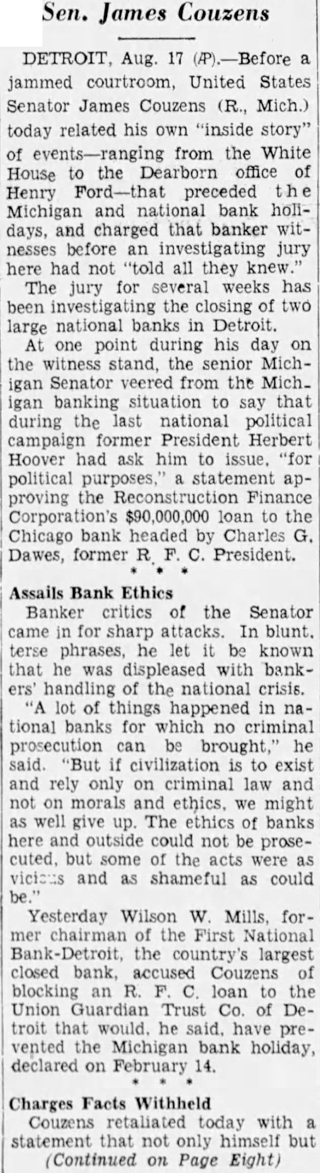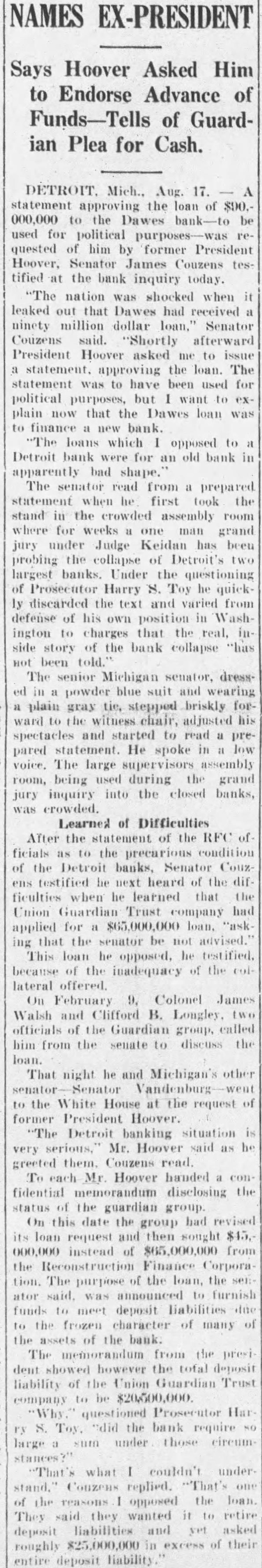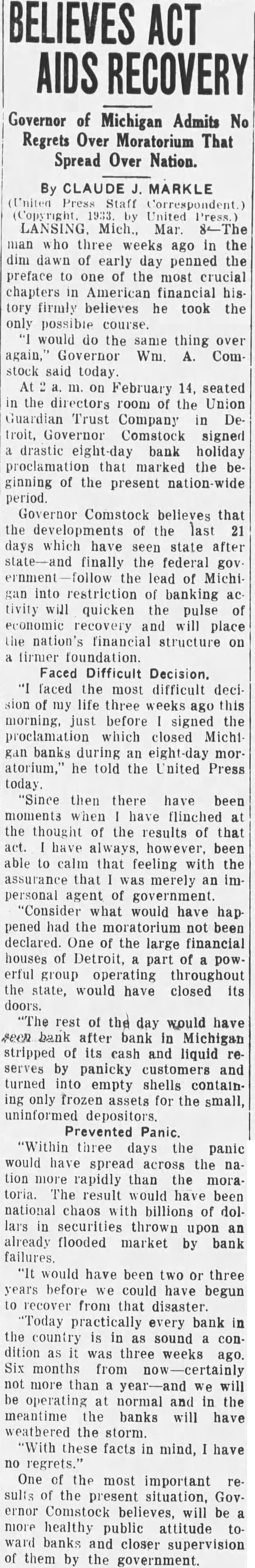 Regrets Over Moratorium That Spread Over Nation. CLAUDE Mich. Mar. three weeks ago in the dim day penned the preface the most crucial chapters his tory firmly believes took the only would the same thing again, Governor Wm. said today February seated the room the Union Trust Company De troit, Comstock signed drastic bank holiday proclamation that marked the ginning of the present period. Comstock believes that the developments the last which have seen state finally the federal gov lead Michiwill quicken the pulse economic place nation's financial structure Faced Difficult Decision. faced the difficult decilife three weeks this just before signed the which closed Michi banks during mor atorium," the United Press then there have been moments flinched thought the results of that been feeling with the assurance that merely personal government. "Consider what would have hap pened the not declared. One of the large financial houses of Detroit, the state, would have closed its rest of the day would have bank bank Michigan stripped its and liquid serves panicky and turned empty shells only frozen assets for the small, Prevented Panic. "Within three the panic would more rapidly than the mora The would been chaos billions dol securities thrown upon an already flooded market by bank would been three before could have begun recover from disaster Today every bank the country sound condition three weeks Six months from not more be operating normal and the meantime banks will have the these facts in mind, have no the most important the present situation, GovComstock believes, will healthy public attitude banks closer supervision them by the government.