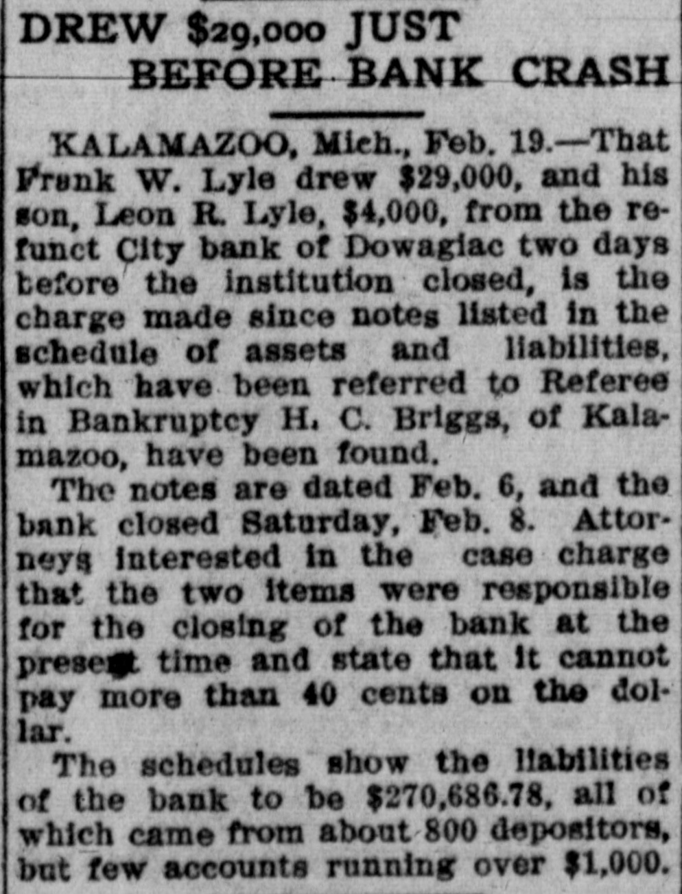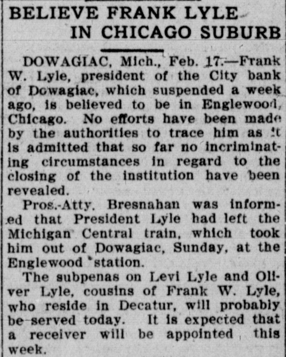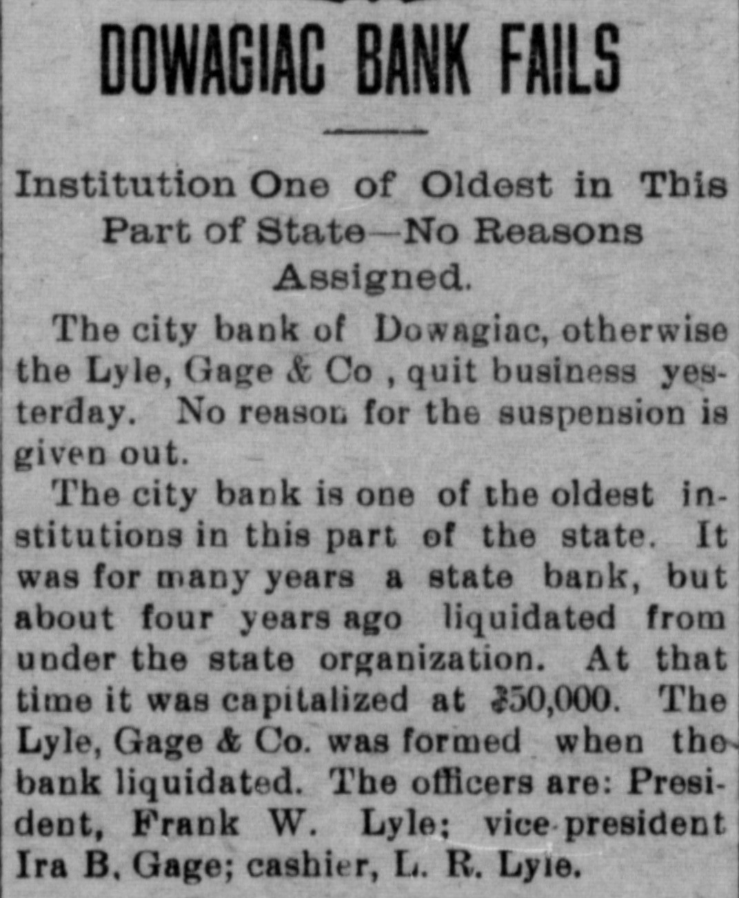 DOWAGIAC BANK FAILS Institution One of Oldest in This Part of State-No Reasons Assigned. The city bank of Dowagiac, otherwise the Lyle, Gage & Co, quit business yesterday. No reason for the suspension is given out. The city bank is one of the oldest institutions in this part of the state. It was for many years a state bank, but about four years ago liquidated from under the state organization. At that time it was capitalized at 350,000. The Lyle, Gage & Co. was formed when the bank liquidated. The officers are: President, Frank W. Lyle: vice-president Ira B. Gage; cashier, L. R. Lyle.