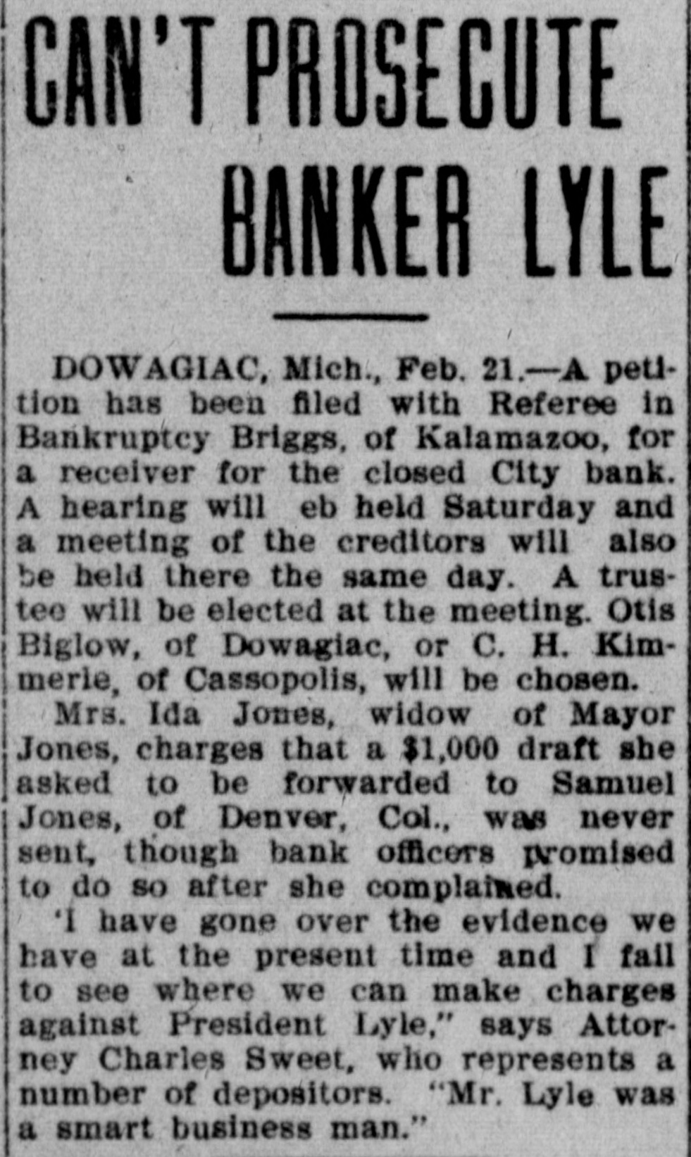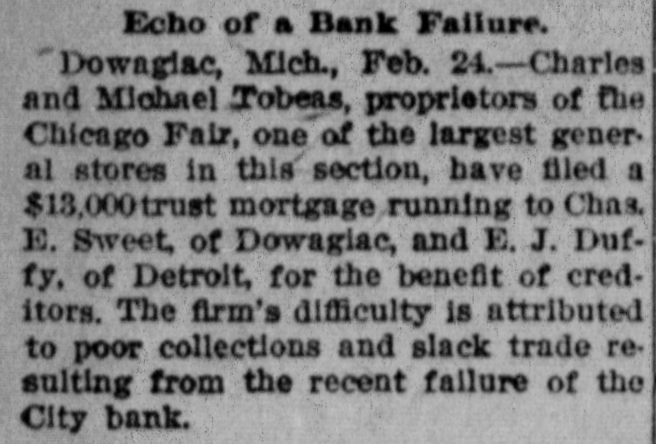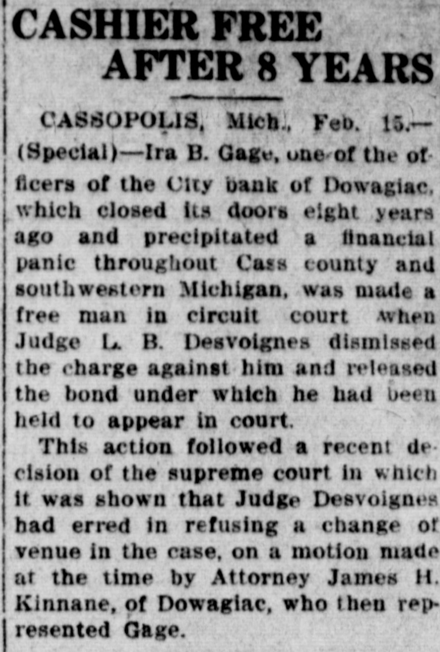 DOWAGIAC BANK FAILS Institution One of Oldest in This Part of State-No Reasons Assigned. The city bank of Dowagiac, otherwise the Lyle, Gage & Co, quit business yesterday. No reason for the suspension is given out. The city bank is one of the oldest institutions in this part of the state. It was for many years a state bank, but about four years ago liquidated from under the state organization. At that time it was capitalized at 350,000. The Lyle, Gage & Co. was formed when the bank liquidated. The officers are: President, Frank W. Lyle: vice-president Ira B. Gage; cashier, L. R. Lyle.