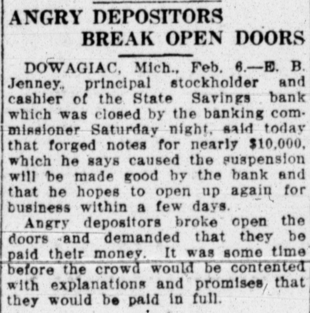 ANGRY DEPOSITORS BREAK OPEN DOORS DOWAGIAC, Mich., Feb. 6.-E. B. Jenney.. principal stockholder and cashier of the State Savings bank which was closed by the banking commissioner Saturday night, said today that forged notes for nearly $10,000, which he says caused the suspension will be made good by the bank and that he hopes to open up again for business within a few days. Angry depositors broke open the doors and demanded that they be paid their money. It was some time before the crowd would be contented with explanations and promises, that they would be paid in full.