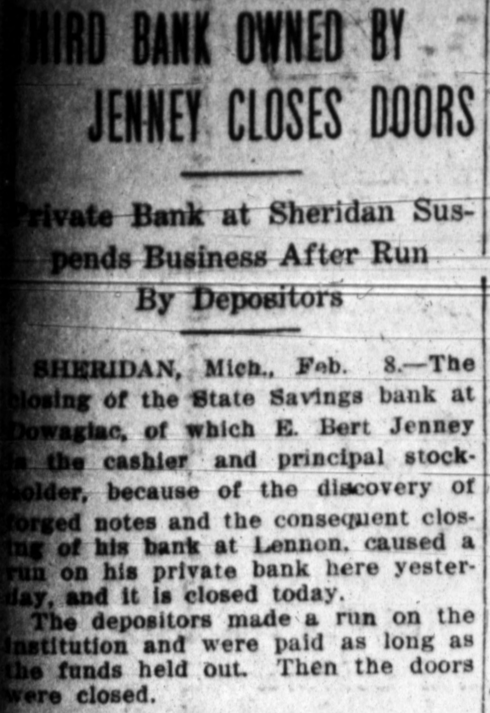 HIRD BANK OWNED BY JENNEY CLOSES DOORS ivate Bank at Sheridan Suspends Business After Run By Depositors SHERIDAN, Mich., Feb. 8.-The losing of the State Savings bank at Dowagiac, of which E. Bert Jenney the cashier and principal stockolder, because of the discovery of forged notes and the consequent closmg of his bank at Lennon. caused a run on his private bank here yesterday, and it is closed today. The depositors made a run on the Institution and were paid as long as the funds held out. Then the doors were closed.