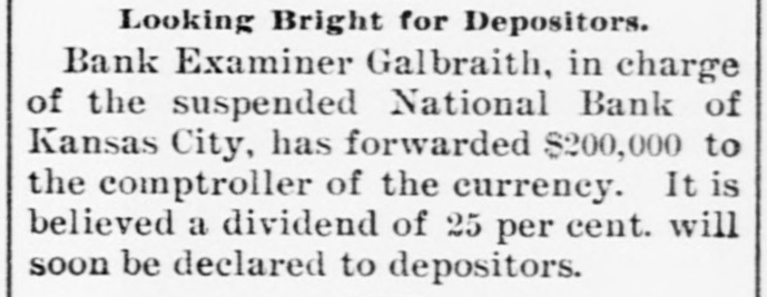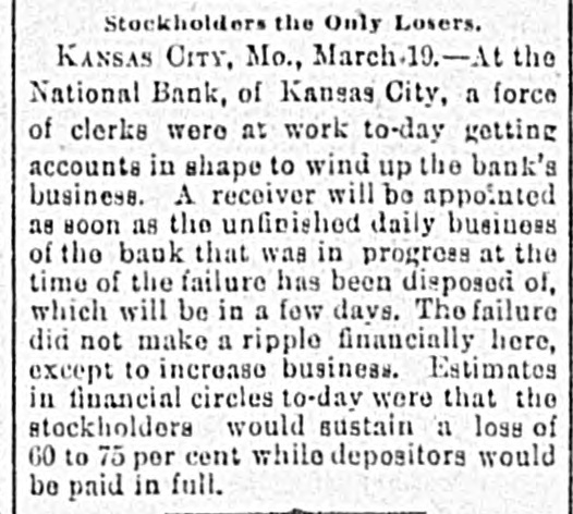 BIG BANK FAILS. National Bank of Kansas City Closes Its Doors. Steady Withdrawal of Deposits Since 1893 the Cause. SUSPENDED BEFORE. The Same Bank Closed During the Panic of '93. None of the Other Banks Will be Affected. KANSAS CITY, March 18.-The National bank of Kansas City failed to open its doors this morning. The direct cause of the failure was the unfavorable statement of bank affairs given out March 5. In the panic of 1893 the bank suspended, but through arrangements between depositors and stockholders it was permitted to resume business. The steady withdrawal of deposits since that time has placed the bank in an embarrassing position and necessitated another suspension. The statement given out is not complete. It shows assets of $1,800,000; liabilities $1,084,000. The Star this afternoon will say editorially that none of the other banks of the city will be in anyway affected, being in splendid condition. Though the bank was known to have been in a shaky condition, the failure was unexpected and the news of the suspension created quite a sensation in financial circles here. The following notices posted on the bank doors were the first intimation the public had that the bank's business had dropped off so much as to force it to close its doors: "10 depositors: The directors and stockholders of this bank have decided to discontinue business. All deposits will be paid in full. "[Signed,) J.S. CHICK, President." A second notice read: 'To W om it May Concern: "Time bank is in the hands of the unG. W. GALBREATH, dersigned. "Comptroller of the Currency." The following figuressh the gradual falling off in the bank's business since the panic of 1893: On July 12, 1893, the total deposits were $1,990,000; February 28, 1894, $1,777,000; March 5, 1895, $990,000. The total deposits aggregate $400,000; cash on hand yesterday $200,000. The bank is the oldest financialinetitution in the city, having been established by J: H. and W. H. Chick before the war. Until the panic of 1893 it was ranked as one of the strongest banks in d the west. In July, 1893, it succumbed to a run and temporarily closed its doors. n Although the capital was reduced and the stockholders paid in a 50 per cent h assessment in the reorganization, the institution has never recovered from the blow it received at that time and its suspension now is directly attributed to that suspension. The officers of the bank are closeted with several of the heavy depositors at this time. It is understood that it is the f intention to wind up the affairs of the ina stitution and retire from business. e President J. S. Chick says that the suspension is merely a liquidation and that not a depositor will lose a cent. Since March 5 the depositors have n been drawing out as they considered S the statement very unfavorable. On Saturday over $60,000 was withdrawn, and the officers saw that if the run continued, they would not be able to cone tinue payment today. f There is 110 probability that any of the other banks will be aflected in any way. t While there was considerable excitement when the suspension was first made public, yet there is the best of feeling among depositors for the officers of the failed institution.