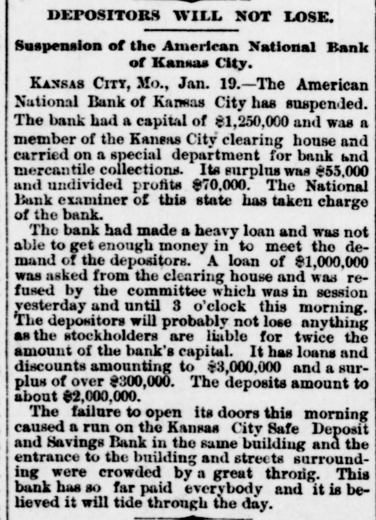 MANY BUSINESS FAILURES. Two Big Ones in Montreal-Westinghouse Applies the Air-Brakes. MONTREAL, Jan. 21.--The firm of Gilmour, Lindsay & Co. had two demands for assignment made upon them today. Their total liabilities are $225,000. McLachian Bros. & Co., whose troubles were noted a few days ago, have assigned, with liabilities of $800,000. NEW YORK, Jan. 21.-The Equitable Insurance Company, because of small capital affairs. and unprontable business, will wind up its The Mound City Distillery Company has secured in New York attachments for $1,291 against Bamberger & Keanpfer, wine dealers, San Francisco. The Suffolk National bank, of Boston, hold a note for $5,000 against Higgins & Co., Brooklyn, N. Y., soap makers. The bank learns that the company has transferred, hence an attachment has been sued out. PITTSBURG. Jan. 21.-A letter from London states that Westinghouse has received $250,000 for airbrake patents from a London company. He is also to receive $30,000 a year to cover any airbrake inventions he may produce. It is the expectation here that Westinghouse will now rescue his electric company, which is in sad financial straits. OMAHA, Jan. 21.-For some unknown cause a run was made on the South Omaha branch of the Nebraska Savings and Exchange bank this afternoon. The bank was kept open till a late hour to pay all the depositors in full. President Miles says the bank is fully prepared to meet every obligation. ATCHISON, Jan. 21.-The Cawker City state bank has failed and is in the hands of a receiver. The liabilities and assets cannot be ascertained. CHICAGO, Jan. 21.-George M. Bogue was this morning appointed receiver of the Pacitic Railway Company, of Los Angeles. Cal., on complaint by judgment creditors. The bill sets forth that the company, which was organized in 1889 by C. B. Holmes, a well-known cable road man, and other capitalists with a capital of $25,000,000, is insolvent. It is stated as probable that the company will shortly be reorganized. A confession of judgment the other day for $1,628 on a note executed January 6, to Edward W. Russell by C. B. Holmes, is said to be the entering wedge in that direction. The Pacific railway is a cable road operated by C. B. Holmes. its president. Thestockholders are mostly Chicago men. Over $1,000,000 was raised in this city alone. Instead of being a paying investment the road has lost money from the start, and now its indebtedness is said to reach $500,000. The trouble seems to be that the investment was too heavy for the amount of business to be done. The recent judgment is said to be the first move by the Chicago stockholders to put the Pacific railway on a new basis. It is, "in fact, a preconcerted movement on the part of the creditors to obtain other judgments and have the road placed in the hands of a receiver. It is the intention to completely reorganize the company. It is said that the road is now earning $350,000 a year net, and that by cutting down expenses and running it on close business principles it can be made to pay, or at least clear expenses. There is a side issue in connection with this matter. A corporation known as the National Railway Company met yesterday. It is one of C. B. Holmes' street car syndicates, and it seems that some of the stock of its St. Louis lines was transferred to the Los Angeles road. The stockholders were inclined to trake a row about it, until explanations were made and a 7 per cent. dividend declared. KANSAS/CITY, Jan. 21.-While the run on the Kansas City Safe Deposit and Savings bank was continued this morning, the indications were that the end is near.