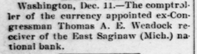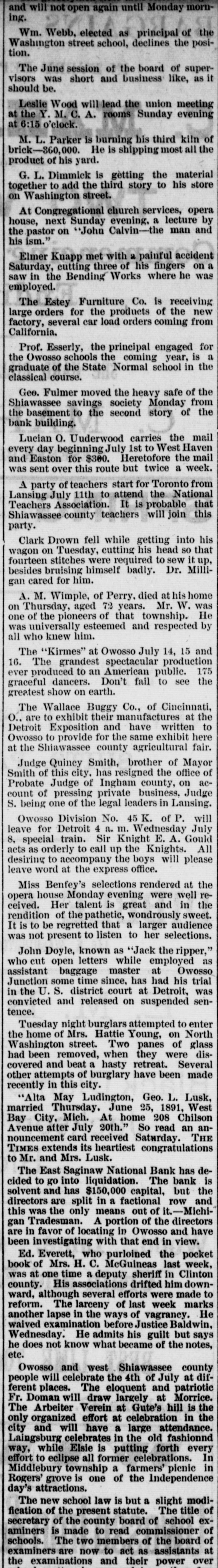 and will not open again until Monday morning. Wm. Webb, elected as principal of the Washington street school, declines the position. The June session of the board of supervisors was short and business like, as it should be. Leslie Wood will lead the union meeting at the Y. M. C. A. rooms Sunday evening at 6:15 o'clock. M. L. Parker is burning his third kiln of brick-360,000. He is shipping most all the product of his yard. G. L. Dimmick is gètting the material together to add the third story to his store on Washington street. At Congregational church services, opera house, next Sunday evening, a lecture by the pastor on "John Calvin-the man and his ism." Elmer Knapp met with a painful accident Saturday, cutting three of his fingers on a saw in the Bending Works where he was employed. The Estey Furniture Co. is receiving large orders for the products of the new factory, several car load orders coming from California. Prof. Esserly, the principal engaged for the Owosso schools the coming year, is a graduate of the State Normal school in the classical course. Geo. Fulmer moved the heavy safe of the Shiawassee savings society Monday from the basement to the second story of the bank building. Lucian O. Uuderwood carries the mail every day beginning July 1st to West Haven and Easton for $300. Heretofore the mail was sent over this route but twice a week. A party of teachers start for Toronto from Lansing July 11th to attend the National Teachers Association. It is probable that Shiawassee county teachers will join this party. Clark Drown fell while getting into his wagon on Tuesday, cutting his head so that fourteen stitches were required to sew it up, besides bruising himself badly. Dr. Milligan cared for him. A. M. Wimple, of Perry. died at his home on Thursday, aged 73 years. Mr. W. was one of the pioneers of that township. He was universally esteemed and respected by all who knew him. The "Kirmes" at Owosso July 14, 15 and 16. The grandest spectacular production ever produced to an American public. 175 graceful dancers. Don't fail to see the greatest show on earth. The Wallace Buggy Co., of Cincinnati, o., are to exhibit their manufactures at the Detroit Exposition and have written to Owosso to provide for the same exhibit here at the Shiawassee county agricultural fair. Judge Quincy Smith, brother of Mayor Smith of this city, has resigned the office of Probate Judge of Ingham county, on account of pressing private business, Judge S. being one of the legal leaders in Lansing. Owosso Division No. 45 K. of P. will leave for Detroit 4 a. m. Wednesday July 8, special train. Sir Knight E. A. Gould acts as orderly to call up the Knights. All desiring to accompany the boys will please leave word at the express office. Miss Benfey's selections rendered at the opera house Monday evening were well received. Her talent is great and in the rendition of the pathetic, wondrously sweet. It is to be regretted that a larger audience was not present to listen to her selections. John Doyle, known as "Jack the ripper," who cut open letters while employed as assistant baggage master at Owosso Junction some time since, has had his trial in the U. S. district court at Detroit, was convicted and released on suspended sentence. Tuesday night burglars attempted to enter the home of Mrs. Hattie Young, on North Washington street. Two panes of glass had been removed, when they were discovered and beat a hasty retreat. Several other attempts of burglary have been made recently in this city. "Alta May Ludington, Geo. L. Lusk, married Thursday. June 25, 1891, West Bay City, Mich. At home 208 Chilson Avenue after July 20th." So read an announcement card received Saturday. THE TIMES extends its heartiest congratulations to Mr. and Mrs. Lusk. The East Saginaw National Bank has decided to go into liquidation. The bank is solvent and has $150,000 capital, but the directors are split in a factional row and this was the only means out of it.-Michigan Tradesman. A portion of the directors are in favor of locating in Owosso and have been investigating with that end in view. Ed. Everett, who purloined the pocket book of Mrs. H. C. McGuineas last week, was at one time a deputy sheriff in Clinton county. His associations drifted him downward, although several efforts were made to reform. The larceny of last week marks another lapse in the ways of vagrancy. He waived examination before Justice Baldwin, Wednesday. He admits his guilt but says he does not know what became of the notes, etc. Owosso and west Shiawassee county people will celebrate the 4th of July at different places. The eloquent and patriotic Fr. Doman will draw largely at Morrice. The Arbeiter Verein at Gute's hill is the only organized effort at celebration in the city and will have a large attendance. Laingsburg celebrates in the old fashionnd way, while Elsie is putting forth every effort to eclipse all former celebrations. In Middlebury township a farmers' pienic in Rogers' grove is one of the Independence day's attractions. The new school law is but a slight modification of the present statute. The title of secretary of the county board of school examiners is made to read commissioner of schools. The two members of the board of examiners are now to act as assistants at the examinations and their power over