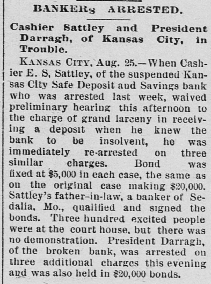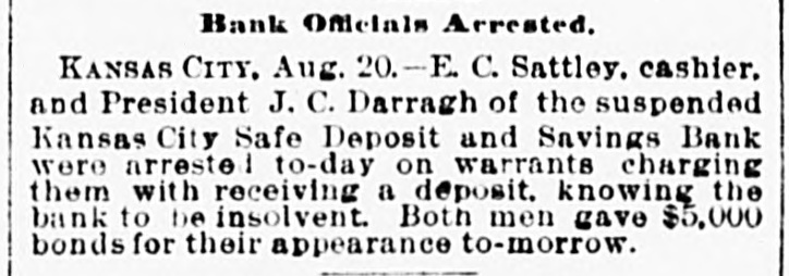 MISSOURI STATE NEWS. Awarded Damages. In the circuit court at Mexico Mrs. Mary F. Eagleton, of St. Louis, was awarded damages in the sum of $1,450 against George Kabrich, of Mexico, and C. C. Longley, of St. Louis. Mrs. Eagleton brought suit for $5,000 for alleged false imprisonment and malicious prosecution. In January. 1894. she lived in Audrain county and ran a dry goods bill with Kabrich & Longley of $35, and later attempted to leave without settling the account. Mrs. Eagleton was pursued and arrested by an officer, returned to Mexico, and confined in jail on the charge of obtaining goods under false pretenses. Being in & delicate condition she was afterward. under guard, moved to a hotel, where she became a mother. and the charge was withdrawn. The trial lasted two days. The verdict. jury was four hours deliberating upon the How Farmer Barnard was Robbed. David A. Barnard, who lives near Macon, was robbed of $85 and a certified check for $500 the other day. Barnard was on a train, and was approaching Kearney. He had been talking to Pearl Rodgers, aged 19, of Kansas City. As Rodgers got up to leave the train. he put his arm around the old farmer's neck and told him to try and get him a job, as he was an orphan. The pecketbook was slipped from Barnard's inside vest pocket. Rodgers was seen to run rapidly away. and. being suspected by officers of doing something wrong, was pursued and captured after a long chase. The check and money were recovered. Too Bad. Mr. and Mrs. A. H. Horn, of Steelville, went outing a few days ago, and it proved a very sad affair. Mr. Horn placed a loaded-shotgun against a ledge, and Mrs. Horn knocked it down. the charge entering her side. Mr. Horn ran for assistance. and on his return found his wife stil alive. In the presence of those who returned with him she kissed him good-by, sent messages to friends, narrated how the accident occurred and said her husband was not to blame. She died in two hours. In a few weeks she would have become a mother. Mrs. Horn was Miss Minnie Davis. a teacher in the public schools. and she and her husband, both young, were popular. Bank Directors Exempt. Judge Broaddus, in the circuit court at Liberty, decided in the case of C. A. Stevenau against the directors of the Kansas City Safe Deposit and Savings bank, which failed in 1893, that the attachments run by depositors on the property of the bank directors are invalid. Eight thousand depositors, holding claims against the bank, are thus without recourse at law. Killed His Son-in-Law. An old feud which had been kept alive several years between Joe Peters and his son-in-law, John Dudley, two farmers near Seymour, terminated the other day in a row over a load of hay. Peters drew his knife and stabbed Dudley four times. Dudley died the next morning. Peters is under arrest. Gov. Stone's Appointments. Gov. Stone has appointed R. C. Culver to be judge of the criminal court of St. Joseph; Thomas H. Ryan. police commissioner of the city of St. Joseph, to succeed himself, and Dr. E. A. Donelan, a member of the Missouri fish commission, in place of H. M. Garlichs, removed. A Human Torch. Henry Schwartz was fatally burned in Kansas City by gasoline exploding. He ran several squares with his clothes aflame, jumping from a second-story window. Only three weeks before Schwartz married his sweetheart, who came from the old country. His Identity Revealed. Ben Myers, arrested for participation in Chicago & Alton hold-up in which Engineer Frank Holmes was killed, near Carlinville, Ill., proves, it is said, to be Bernard Reinagel, of Manchester, St. Louis county, and well connected. Elocutionary Contest. The Epworth league of Centenary Methodist church, south, of Nevada, will give an elocutionary contest August 28, for a $125 gold and diamondset medal. The contest is open to all