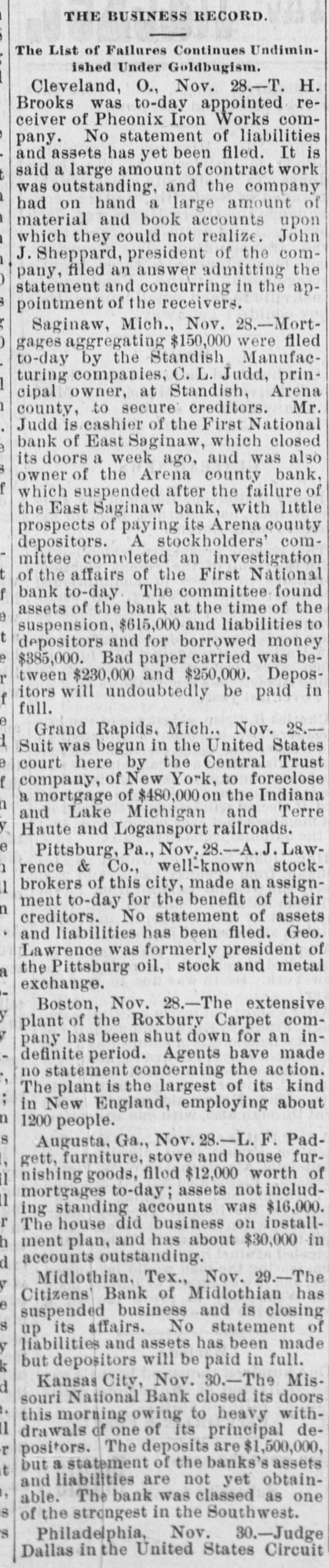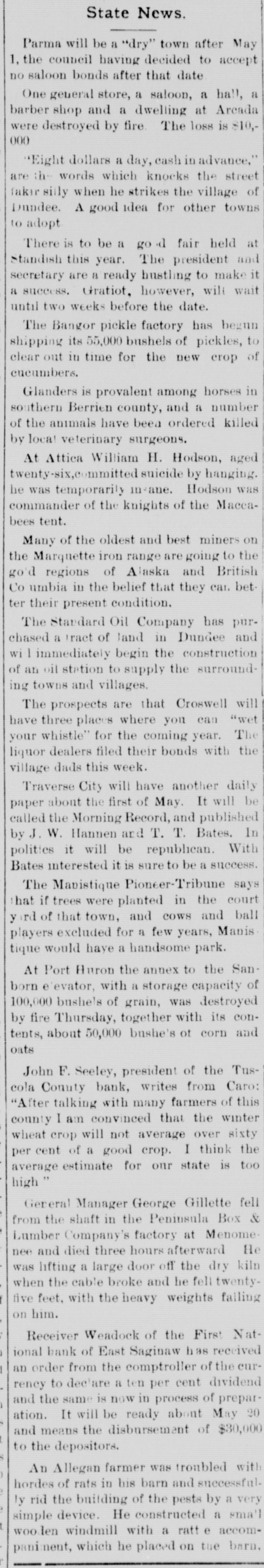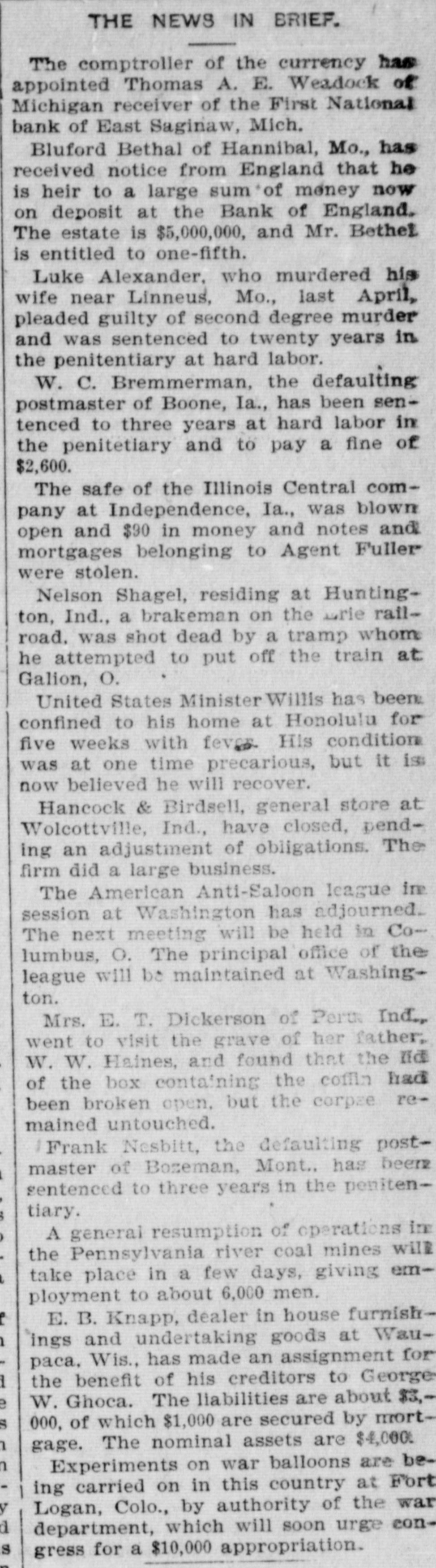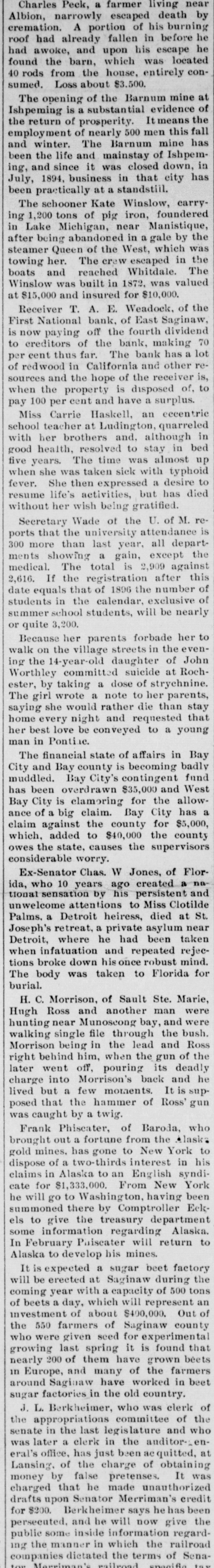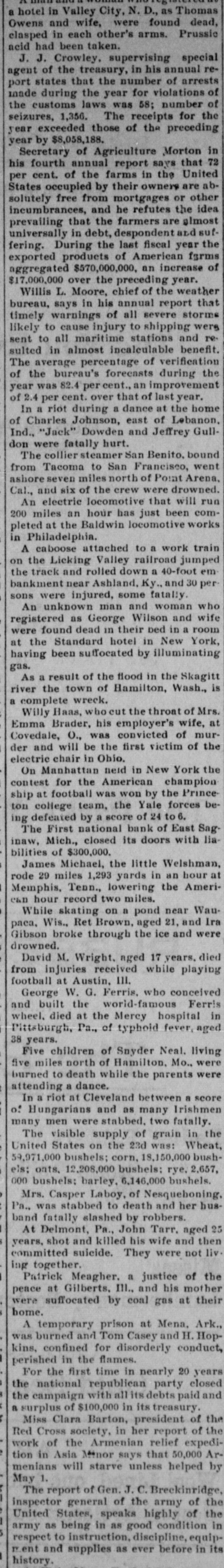 a hotel in Valley City, N. D., as Thomas Owens and wife, were found dead, clasped in each other's arms. Prussic acid had been taken. J. J. Crowley, supervising special agent of the treasury, in his annual report states that the number of arrests made during the year for violations of the customs laws was 58; number of seizures, 1,356. The receipts for the year exceeded those of the preceding year by $8,058,188. Secretary of Agriculture Morton in his fourth annual report says that 72 per cent. of the farms in the United States occupied by their owners are absolutely free from mortgages or other incumbrances, and he refutes the idea prevailing that the farmers are glmost universally in debt, despondent and suffering. During the last fiscal year the exported products of American fgrms aggregated $570,000,000, an increase of $17,000,000 over the preceding year. Willis L. Moore, chief of the weather bureau, says in his annual report that timely warnings of all severe storms likely to cause injury to shipping were sent to all maritime stations and resulted in almost incalculable benefit. The average percentage of verification of the bureau's forecasts during the year was 82.4 cent., an improvement of 2.4 per cent. over that of last year. In a riot during a dance at the home of Charles Johnson, east of Lebanon, Ind., "Jack" Dowden and Jeffrey Gulldon were fatally hurt. The collier steamer San Benito, bound from Tacoma to San Francisco, went ashore seven miles north of Point Arena, Cal., and six of the crew were drowned. An electric locomotive that will run 200 miles an hour has just been completed at the Baldwin locomotive works in Philadelphia. A caboose attached to a work train on the Licking Valley railroad jumped the track and rolled down a 40-foot em bankment near Ashland, Ky., and 30 persons were injured, some fatally. An unknown man and woman who registered as George Wilson and wife were found dead in their bed in a room at the Standard hotel in New York, having been suffocated by illuminating gas. As a result of the flood in the Skagitt river the town of Hamilton, Wash., is a complete wreck. Willy Haas, who cut the throat of Mrs. Emma Brader, his employer's wife, at Covedale, O., was convicted of murder and will be the first victim of the electric chair in Obio. On Manhattan neid in New York the contest for the American champion ship at football was won by the Princeton college team, the Yale forces being defeated by a score of 24 to 6. The First national bank of East Saginaw, Mich., closed its doors with liabilities of $300,000. James Michael, the little Welshman, rode 29 miles 1,293 yards in an hour at Memphis, Tenn., lowering the American hour record two miles. While skating on a pond near Waupaca, Wis., Ret Brown, aged 21, and Ira Gibson broke through the ice and were drowned. David M. Wright, aged 17 years. died from injuries received while playing football at Austin, III. George W. G. Ferris, who conceived and built the world-famous Ferris wheel, died at the Mercy hospital in Pittsburgh, Pa., of typhoid fever, aged 38 years. Five children of Snyder Neal. living five miles north of Hamilton, Mo., were burned to death while the parents were attending a dance. In a riot at Cleveland between a score of Hungarians and as many Irishmen many men were stabbed, two fatally. The visible supply of grain in the United States on the 23d was: Wheat, 59,971,000 bushels; corn, 18,150,000 bushels; onts, 12,208,000 bushels: rye. 2,657, 000 bushels; barley, 6,146,000 bushels. Mrs. Casper Laboy, of Nesqueboning, Pa., was stabbed to death and her husband fatally slashed by robbers. At Delmont, Pa., John Tarr, aged 25 years, shot and killed his wife and then committed suicide. They were not liv ing together. Patrick Meagher. a justice of the peace at Gilberts, III., and his mother were suffocated by coal gas at their home. A temporary prison at Mena, Ark., was burned and Tom Casey and H. Hopkins, confined for disorderly conduct, perished in the flames. For the first time in nearly 20 years the national republican party closed the campaign with all its debts paid and a surplus of $100,000 in its treasury. Miss Clara Barton, president of the Red Cross society, in her report of the work of the Armenian relief expedition in Asia Minor says that 50,000 Armenians will starve unless helped by May 1