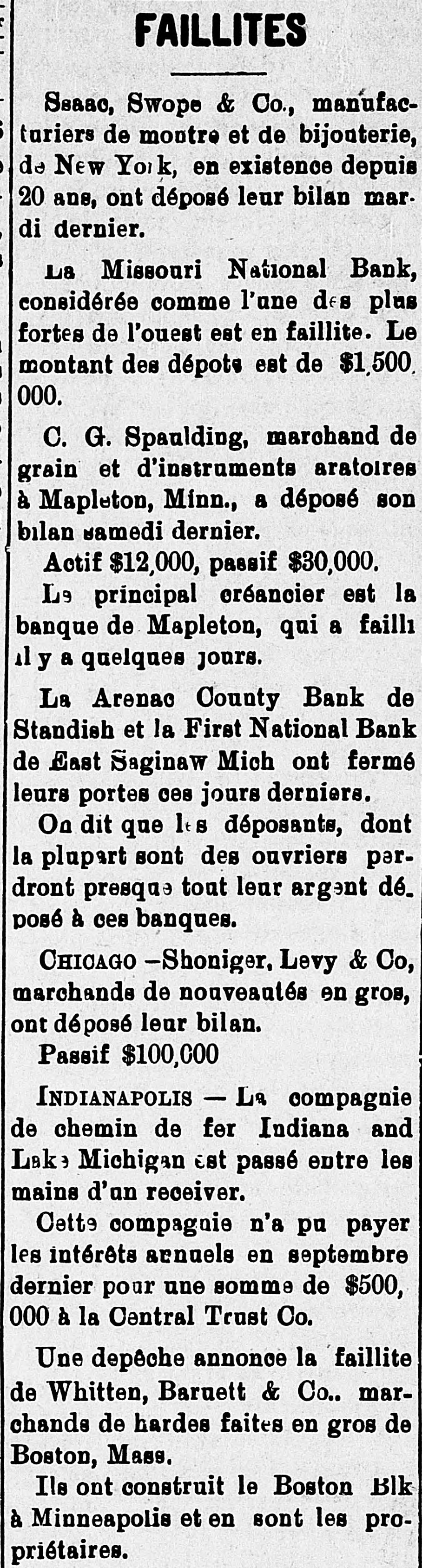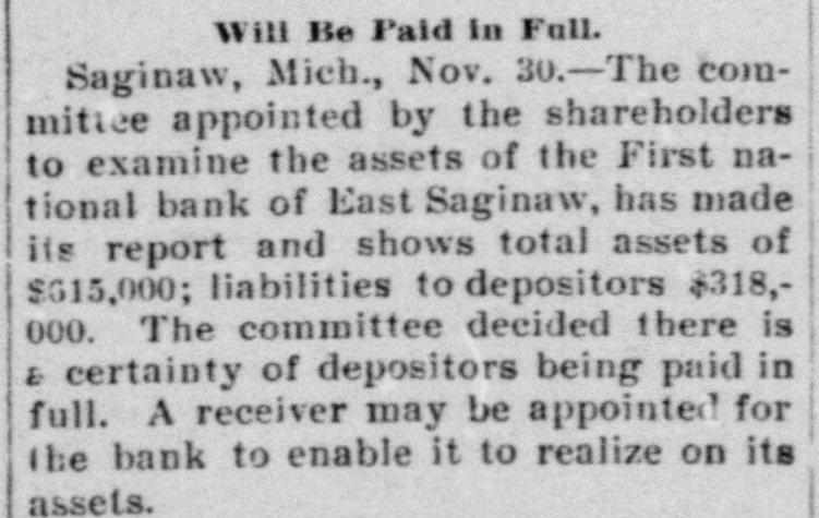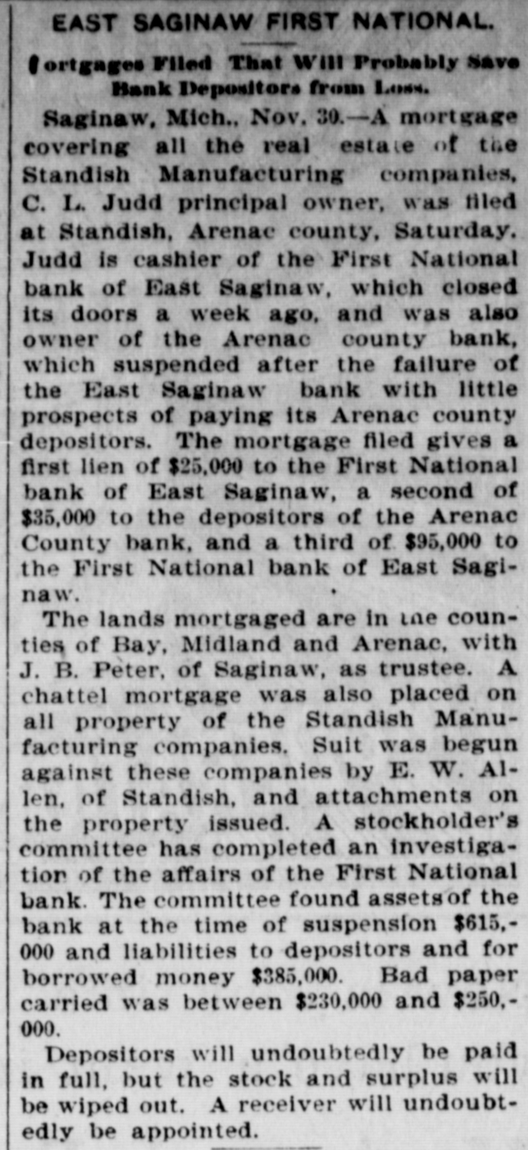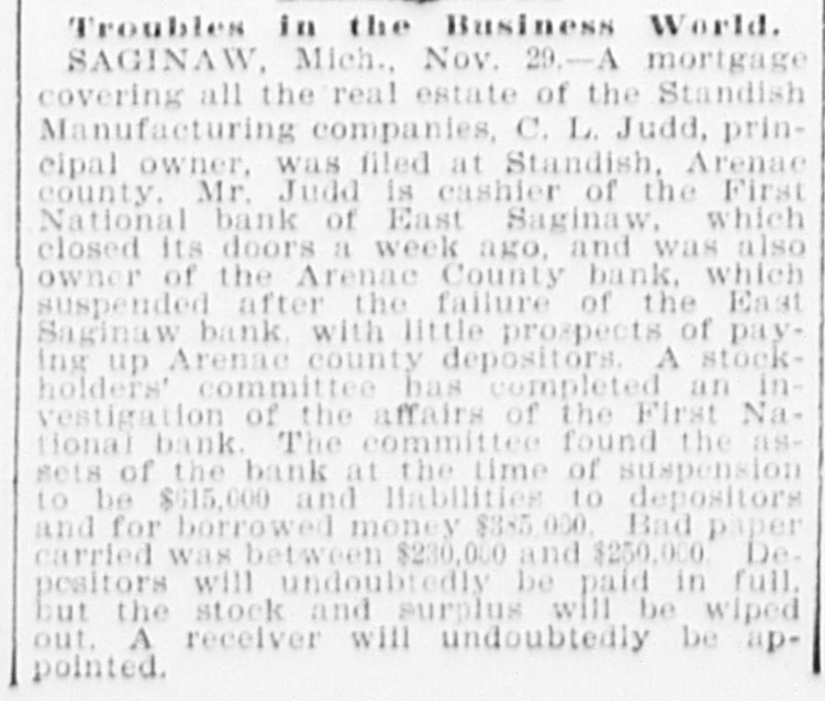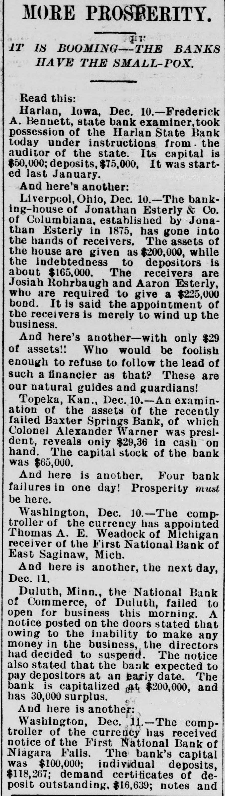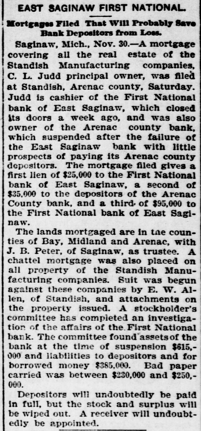 a hotel in Valley City, N. D., as Thomas Owens and wife, were found dead, clasped in each other's arms. Prussic acid had been taken. J. J. Crowley, supervising special agent of the treasury, in his annual report states that the number of arrests made during the year for violations of the customs laws was 58; number of seizures, 1,356. The receipts for the year exceeded those of the preceding year by $8,058,188. Secretary of Agriculture Morton in his fourth annual report says that 72 per cent. of the farms in the United States occupied by their owners are absolutely free from mortgages or other incumbrances, and he refutes the idea prevailing that the farmers are glmost universally in debt, despondent and suffering. During the last fiscal year the exported products of American fgrms aggregated $570,000,000, an increase of $17,000,000 over the preceding year. Willis L. Moore, chief of the weather bureau, says in his annual report that timely warnings of all severe storms likely to cause injury to shipping were sent to all maritime stations and resulted in almost incalculable benefit. The average percentage of verification of the bureau's forecasts during the year was 82.4 cent., an improvement of 2.4 per cent. over that of last year. In a riot during a dance at the home of Charles Johnson, east of Lebanon, Ind., "Jack" Dowden and Jeffrey Gulldon were fatally hurt. The collier steamer San Benito, bound from Tacoma to San Francisco, went ashore seven miles north of Point Arena, Cal., and six of the crew were drowned. An electric locomotive that will run 200 miles an hour has just been completed at the Baldwin locomotive works in Philadelphia. A caboose attached to a work train on the Licking Valley railroad jumped the track and rolled down a 40-foot em bankment near Ashland, Ky., and 30 persons were injured, some fatally. An unknown man and woman who registered as George Wilson and wife were found dead in their bed in a room at the Standard hotel in New York, having been suffocated by illuminating gas. As a result of the flood in the Skagitt river the town of Hamilton, Wash., is a complete wreck. Willy Haas, who cut the throat of Mrs. Emma Brader, his employer's wife, at Covedale, O., was convicted of murder and will be the first victim of the electric chair in Obio. On Manhattan neid in New York the contest for the American champion ship at football was won by the Princeton college team, the Yale forces being defeated by a score of 24 to 6. The First national bank of East Saginaw, Mich., closed its doors with liabilities of $300,000. James Michael, the little Welshman, rode 29 miles 1,293 yards in an hour at Memphis, Tenn., lowering the American hour record two miles. While skating on a pond near Waupaca, Wis., Ret Brown, aged 21, and Ira Gibson broke through the ice and were drowned. David M. Wright, aged 17 years. died from injuries received while playing football at Austin, III. George W. G. Ferris, who conceived and built the world-famous Ferris wheel, died at the Mercy hospital in Pittsburgh, Pa., of typhoid fever, aged 38 years. Five children of Snyder Neal. living five miles north of Hamilton, Mo., were burned to death while the parents were attending a dance. In a riot at Cleveland between a score of Hungarians and as many Irishmen many men were stabbed, two fatally. The visible supply of grain in the United States on the 23d was: Wheat, 59,971,000 bushels; corn, 18,150,000 bushels; onts, 12,208,000 bushels: rye. 2,657, 000 bushels; barley, 6,146,000 bushels. Mrs. Casper Laboy, of Nesqueboning, Pa., was stabbed to death and her husband fatally slashed by robbers. At Delmont, Pa., John Tarr, aged 25 years, shot and killed his wife and then committed suicide. They were not liv ing together. Patrick Meagher. a justice of the peace at Gilberts, III., and his mother were suffocated by coal gas at their home. A temporary prison at Mena, Ark., was burned and Tom Casey and H. Hopkins, confined for disorderly conduct, perished in the flames. For the first time in nearly 20 years the national republican party closed the campaign with all its debts paid and a surplus of $100,000 in its treasury. Miss Clara Barton, president of the Red Cross society, in her report of the work of the Armenian relief expedition in Asia Minor says that 50,000 Armenians will starve unless helped by May 1