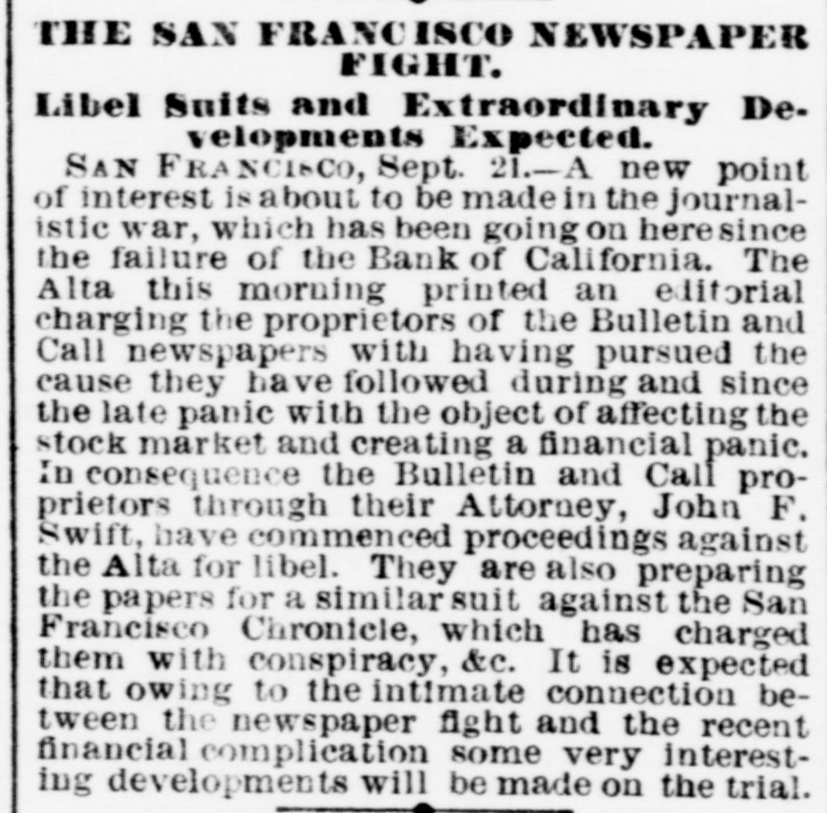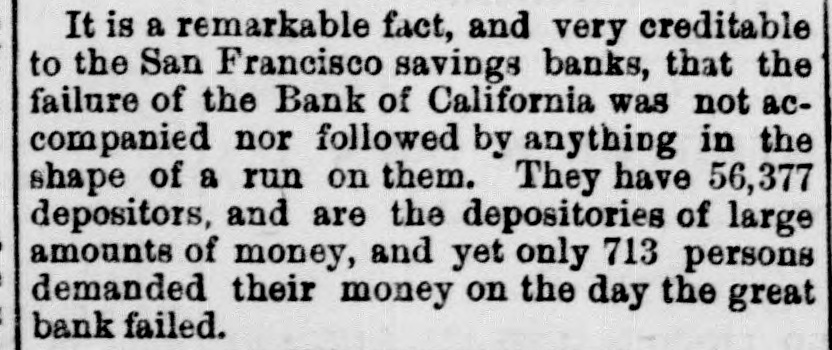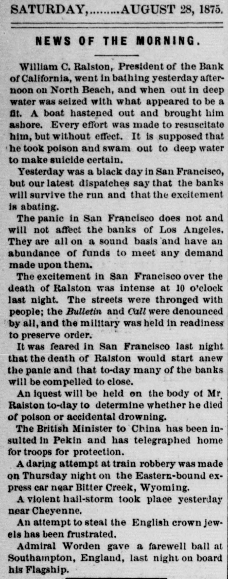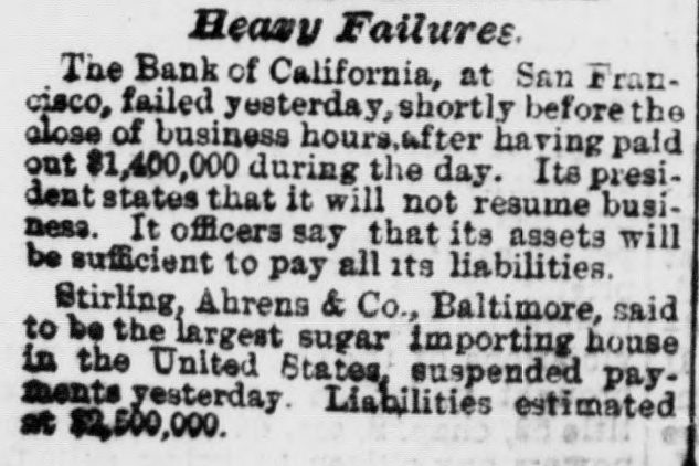 The Failure in San Francisco. On Thursday of last week a run was made on the Bank of California, to which it succumbed after nearly a million and a half of dollars had been paid out during the day to the clamoring crowd of depositors. The failure is the more surprising as the bank was one of discount and deposit only, not having the privilege of circulation, and did business exclusively on a gold basis. Its capital was five millions of dollars, but its reserves were understood to be of much greater amount. The bank was a state institution, organized under a law of California, and was at the very head of the fiscal institutions of the Pacific coast. Of late years it had been largely engaged in the most speculative enterprises of that region, and, under the claim of developing the resources of the Pacific coast, had locked up largely of its cash means in unproductive investments. It travelled wide from the path of legitimate banking, with the result usual to a gambling propensity, to accept great hazards in the hope of large and sudden gains. The managers of the bank, have been engaged in an infinite variety of enterprises, and became involved, directly or indirectly, in almost every industrial project of any note within its reach. Its connections were far-reaching and intricate. The famous Palace Hotel, San Francisco, an enormous structure, is among the speculative ventures of the president, he having purchased the interest in that concern of his sole partner, Senator Sharon, of Nevada. This bank was organized in July, 1864, and had at that time a capital of $2,000,000, which was increased to $5,000,000, on which sum a regular monthly dividend of one per cent. was paid. Its list of officers and stockholders included the names of many of the leading citizens of California, and its influence extended to every part of the country. Its foreign relations were unusually extensive. It had correspondents and drew directly on London, Dublin, Paris, St. Petersburg, Am sterdam, Antwerp, Hamburg, Bremen, Berlin, Leipsic, Vienna, Frankfort-on the holm, Copenhagen, Christiana, Goteborg, Locarno, Melbourne, Sydney, Auckland, New Zealand, Hong Kong, Shanghai, Yokohama. In addition to these the bank had agencies at Virginia City and Gold Hill, and correspondents in all the principal mining districts and interior towns of the Pacific coast. W. C. Raiston, the President, was the master spirit of the bank, one of those keen, restless "kings of business" who make their mark wherever they go. Until within a year or two he was cashier of the bank and D. O. Mills was present. At the retirement of the latter the cashier was promoted to the head of the institution. In the maguitude of its operations the bank was without a rival in the country, acting as the fiscal agent of the majority of the mining corporations of the Pacific coast, and, it is said, working many of them for the benefit of the institution. Its political power was immense, and the consultation of its officers frequently settled who should be the Mayor of San Franeisco what should be the complexion of its Board of Supervisors and of its staff of city and county officers who should be Governor of the State and who should rule in the Legislature who should go to the U. S. Senate from Nevada or Oregon, and of what character the prevailing majority in the Legislatures of those States should be. Outside of the Pacifie slope its suspension need not seriously affect the current of business. The several reckless enterprises in which the bank locked up its money will suffer, and some of them probably follow the bank into bankruptey. The President committed suieide on Friday, the day after the suspension, by drowning himself. An investigation shows that he had misappropriated over $3,000,000 of the funds of the bank. The liabilities of the bank are roughly estimated at $14,000,000, the assets not exceeding $7,000,000, the latter, of course, subject to many contingencies in collection or realization. Owing to the excited condition of affairs in San Francisco, caused by the failure of the Bank of California, several other banks suspended temporarily, but resumed business this week.