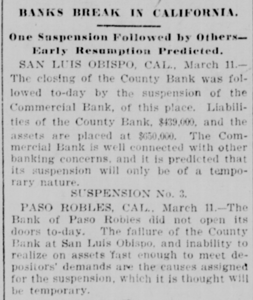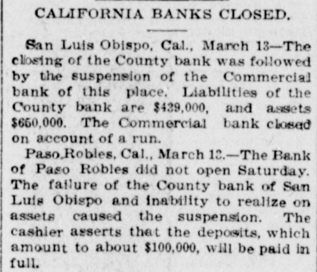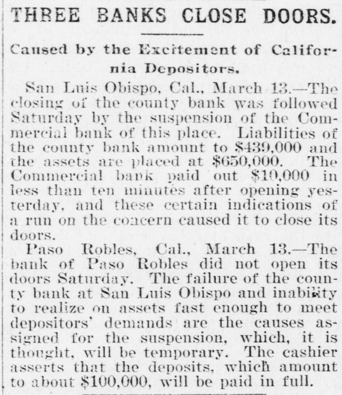 THREE BANKS CLOSE DOORS. Caused by the Excitement of California Depositors. San Luis Obispo, Cal., March 13.-The closing of the county bank was followed Saturday by the suspension of the Commercial bank of this place. Liabilities of the county bank amount to $439,000 and the assets are placed at $650,000. The Commercial bank paid out $10,000 in less than ten minutès after opening yesterday, and these certain indications of a run on the concern caused it to close its doors. Paso Robles, Cal., March 13.-The bank of Paso Robles did not open its doors Saturday. The failure of the county bank at San Luis Obispo and inability to realize on assets fast enough to meet depositors' demands are the causes assigned for the suspension, which, it is thought, will be temporary. The cashier asserts that the deposits, which amount to about $100,000, will be paid in full.