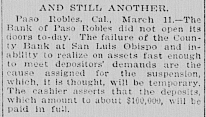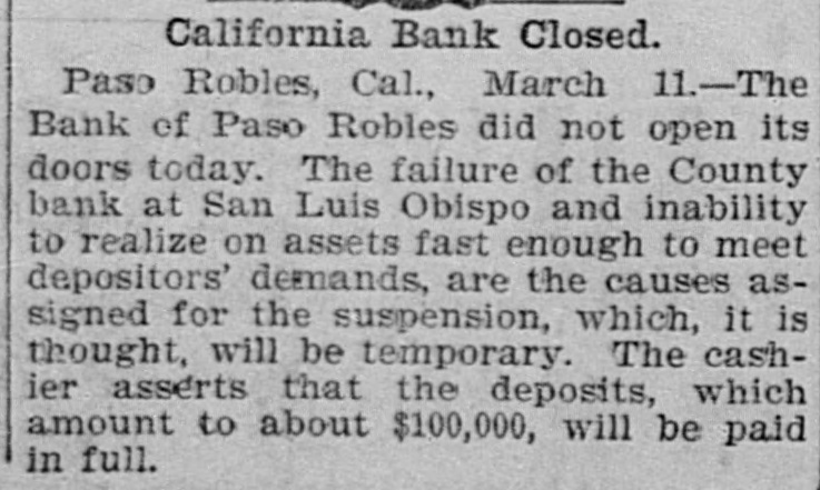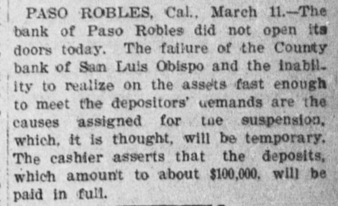 Bank of Paso Robles Closed. Paso Robles, Cal,, March 11.-The Bank of Paso Robles did not open its doors today. The closing of the County Bank at San Luis Obispo and inability to realize on assets fast enough to meet depositors' demands are the causes assigned for the suspension which, it is thought, will be temporary. The cashier asserts that the deposits which amount to about $100,000 will be paid in full.