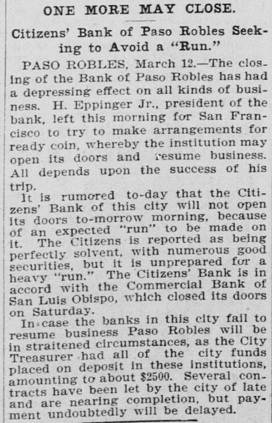 ONE MORE MAY CLOSE. Citizens' Bank of Paso Robles Seeking to Avoid a "Run." PASO ROBLES, March 12.-The closing of the Bank of Paso Robles has had a depressing effect on all kinds of business. H. Eppinger Jr., president of the bank, left this morning for San Francisco to try to make arrangements for ready coin, whereby the institution may open its doors and resume business. All depends upon the success of his trip. It is rumored to-day that the Citizens' Bank of this city will not open its doors to-morrow morning, because of an expected "run" to be made on it. The Citizens is reported as being perfectly solvent, with numerous good securities, but it is unprepared for a heavy "run." The Citizens' Bank is in accord with the Commercial Bank of San Luis Obispo, which closed its doors on Saturday. In case the banks in this city fail to resume business Paso Robles will be in straitened circumstances, as the City Treasurer had all of the city funds placed on deposit in these institutions, amounting to about $2500. Several contracts have been let by the city of late and are nearing completion, but payment undoubtedly will be delayed.