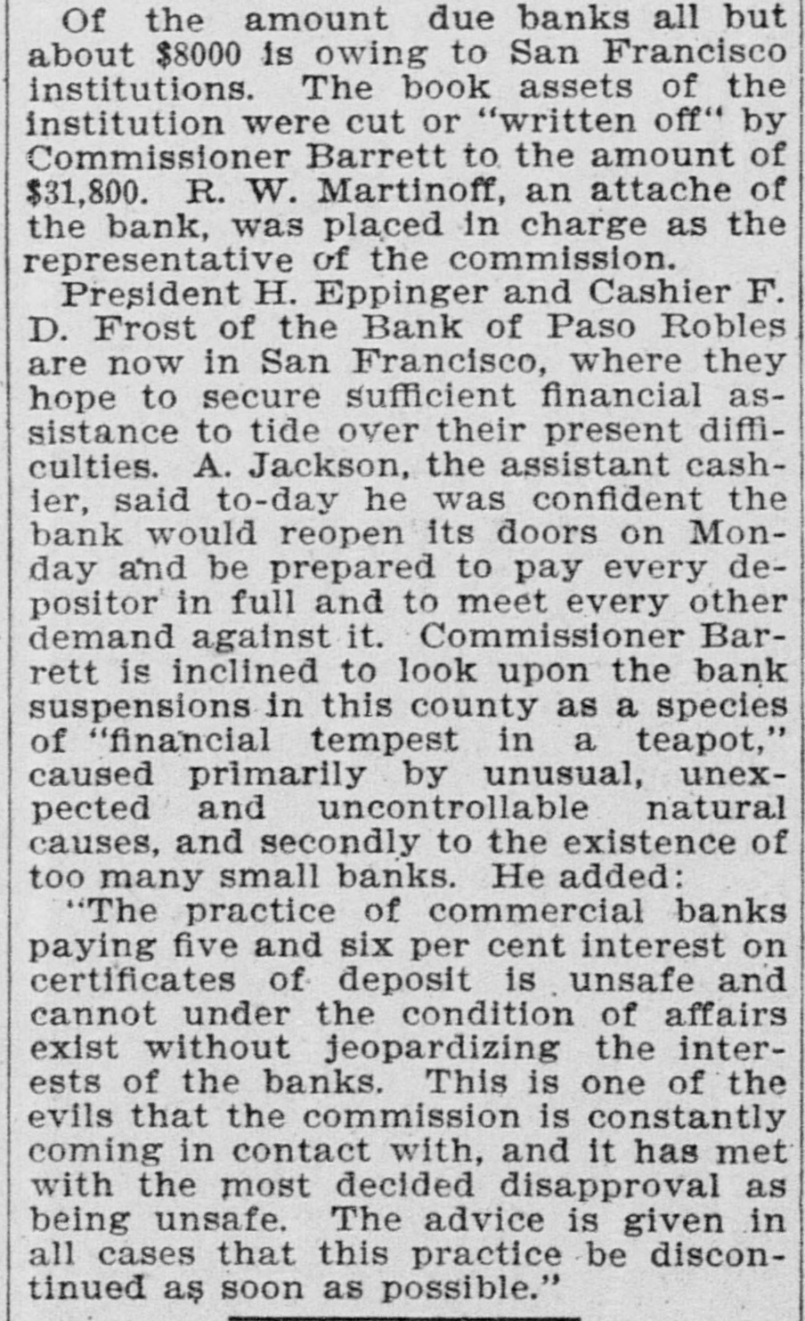 Of the amount due banks all but about $8000 is owing to San Francisco institutions. The book assets of the institution were cut or "written off" by Commissioner Barrett to the amount of $31,800. R. W. Martinoff, an attache of the bank, was placed in charge as the representative of the commission. President H. Eppinger and Cashier F. D. Frost of the Bank of Paso Robles are now in San Francisco, where they hope to secure sufficient financial assistance to tide over their present difficulties. A. Jackson, the assistant cashier, said to-day he was confident the bank would reopen its doors on Monday and be prepared to pay every depositor in full and to meet every other demand against it. Commissioner Barrett is inclined to look upon the bank suspensions in this county as a species of "financial tempest in a teapot," caused primarily by unusual, unexpected and uncontrollable natural causes, and secondly to the existence of too many small banks. He added: "The practice of commercial banks paying five and six per cent interest on certificates of deposit is unsafe and cannot under the condition of affairs exist without jeopardizing the interests of the banks. This is one of the evils that the commission is constantly coming in contact with, and it has met with the most decided disapproval as being unsafe. The advice is given in all cases that this practice be discontinued as soon as possible."