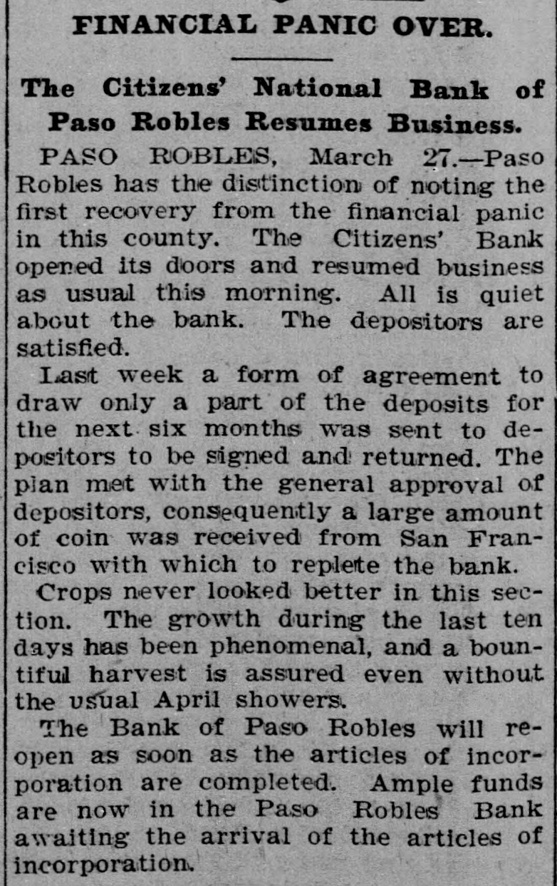 FINANCIAL PANIC OVER. The Citizens' National Bank of Paso Robles Resumes Business. PASO ROBLES, March 27.-Paso Robles has the distinction of noting the first recovery from the financial panic in this county. The Citizens' Bank opened its doors and resumed business as usual this morning. All is quiet about the bank. The depositors are satisfied. Last week a form of agreement to draw only a part of the deposits for the next six months was sent to depositors to be signed and returned. The plan met with the general approval of depositors, consequently a large amount of coin was received from San Francisco with which to replete the bank. Crops never looked better in this section. The growth during the last ten days has been phenomenal, and a bountiful harvest is assured even without the usual April showers. The Bank of Paso Robles will reopen as soon as the articles of incorporation are completed. Ample funds are now in the Paso Robles Bank awaiting the arrival of the articles of incorporation.