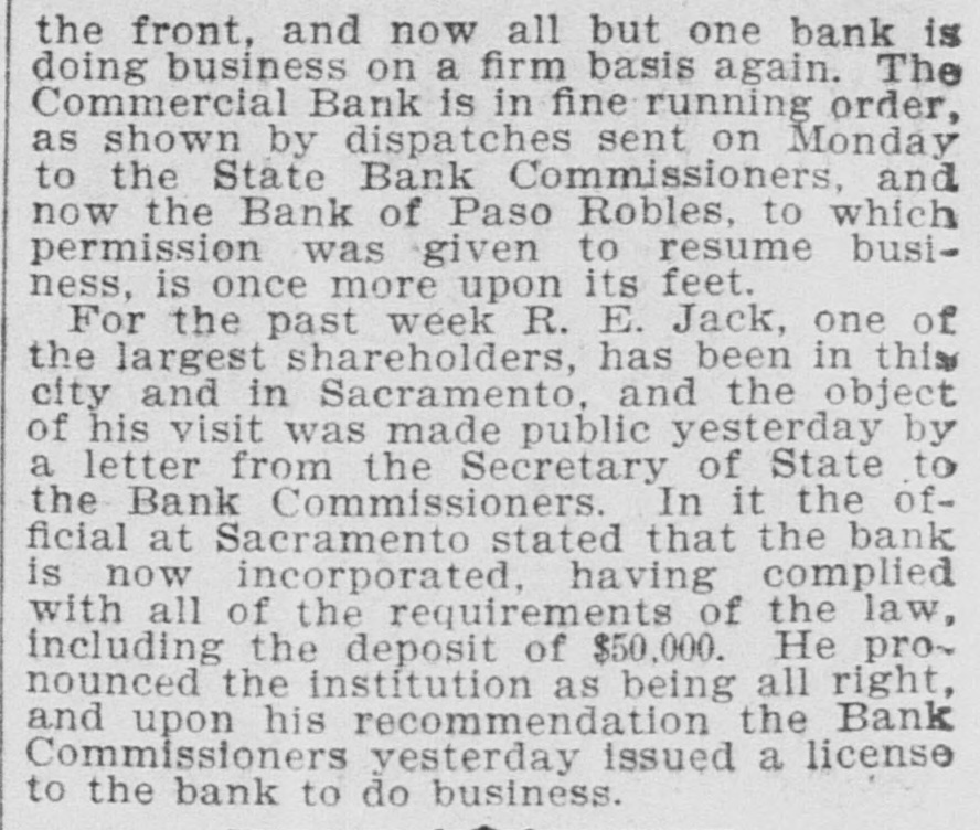 the front, and now all but one bank is doing business on a firm basis again. The Commercial Bank is in fine running order, as shown by dispatches sent on Monday to the State Bank Commissioners, and now the Bank of Paso Robles, to which permission was given to resume business, is once more upon its feet. For the past week R. E. Jack, one of the largest shareholders, has been in this city and in Sacramento, and the object of his visit was made public yesterday by a letter from the Secretary of State to the Bank Commissioners. In it the official at Sacramento stated that the bank is now incorporated, having complied with all of the requirements of the law, including the deposit of $50,000. He pronounced the institution as being all right, and upon his recommendation the Bank Commissioners yesterday issued a license to the bank to do business.