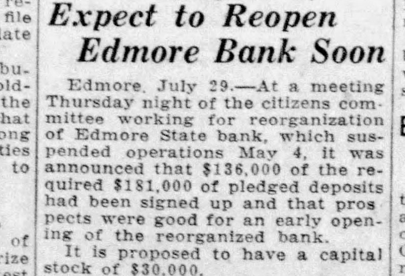 Expect to Reopen Edmore Bank Soon Edmore July meeting Thursday night the com mittee for of State bank, which pended operations May was that of the required 000 of had signed and pros good for an opening of the bank is proposed to have a capital stock of $30,000