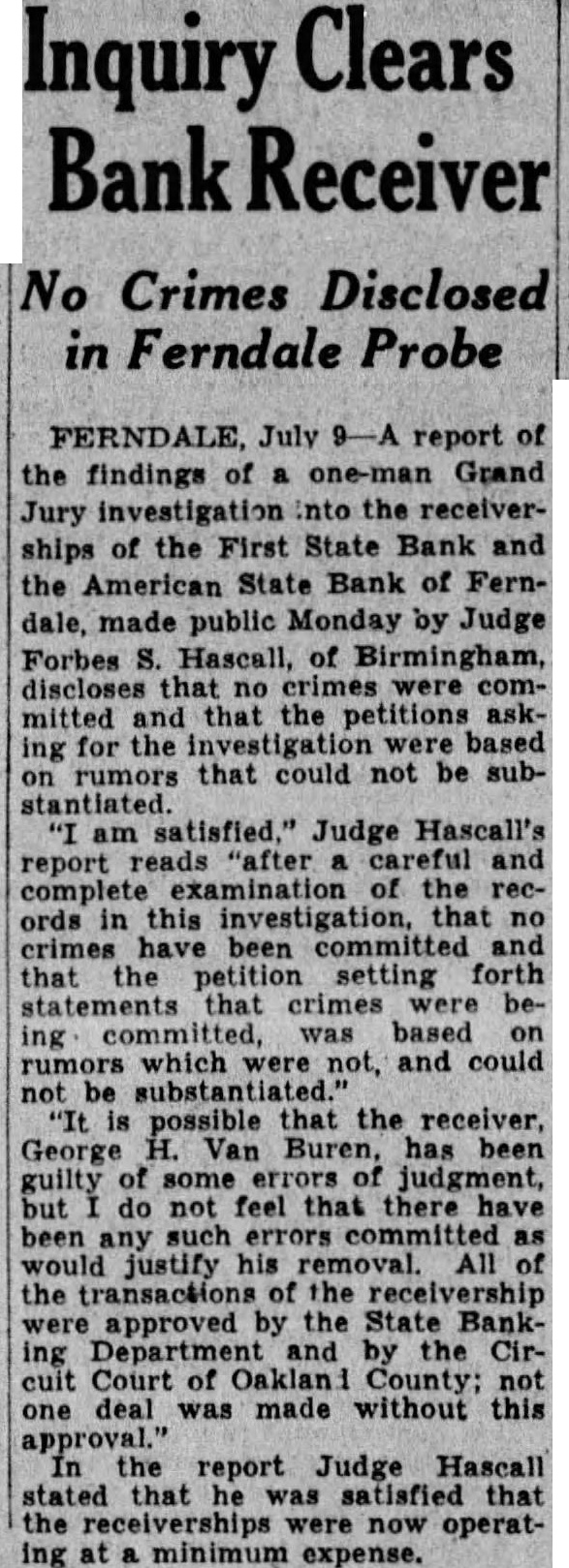 Inquiry Clears Bank Receiver No Crimes Disclosed in Ferndale Probe FERNDALE, July 9-A report of the findings of one-man Grand Jury investigation the receiverships of the First State Bank and the American State Bank of Ferndale, made public Monday by Judge Forbes S. Hascall, of Birmingham, no mitted and that the petitions asking for the investigation were based rumors that could not be subam satisfied." Judge Hascall's report reads "after careful complete examination of the ords in this investigation, that no crimes have been and that petition setting forth statements that crimes were being committed, was based on which were not, and could not be substantiated.' is possible that the receiver, George Van Buren, has been guilty of some errors of judgment, but do not feel that there been any would justify his All the transactions of the were approved by the State Banking Department and by the Circuit Court of Oakland County; not one deal was made without this approval." In the report Judge Hascall stated that he satisfied the were operating minimum expense.