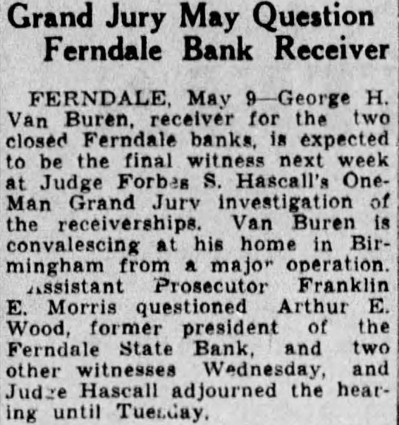 Grand Jury May Question Ferndale Bank Receiver FERNDALE May George H. Van for closed Ferndale expected the final witness Judge Forbes Hascall's OneGrand Buren convalescing home mingham Assistant Prosecutor Franklin Morris questioned Arthur Wood, former president the Ferndale State and witnesses Wednesday, Judze Hascall the hearing until