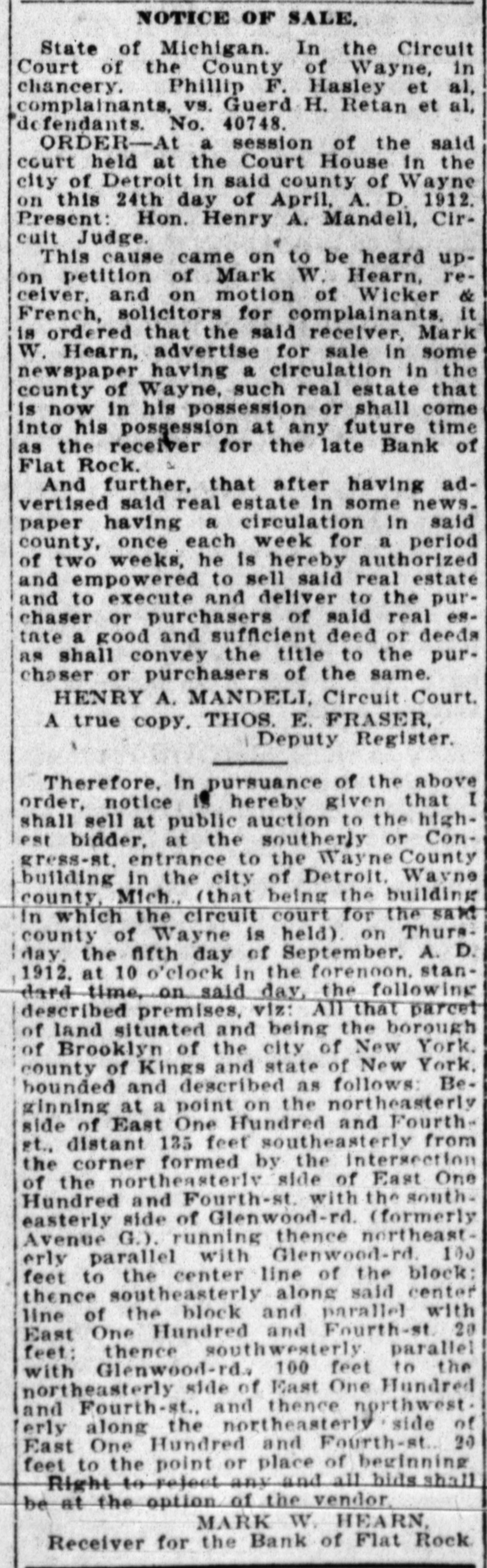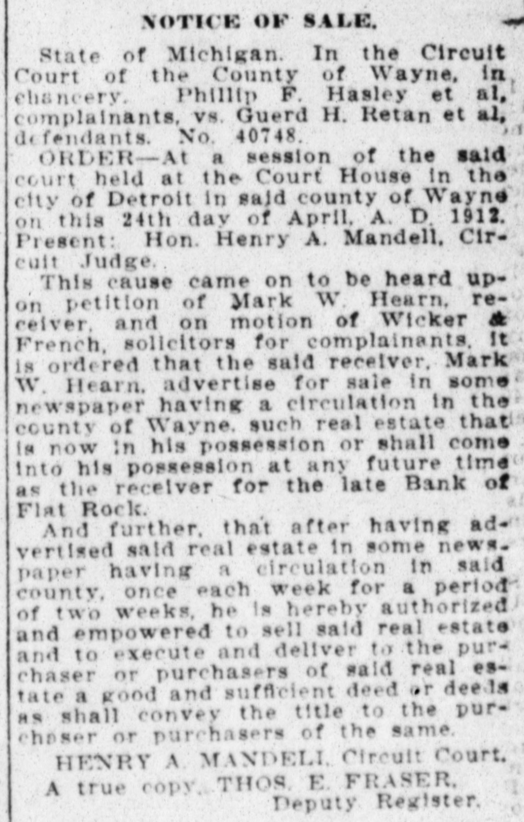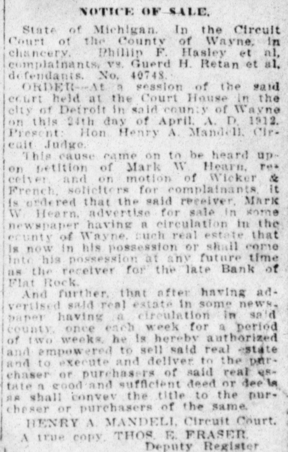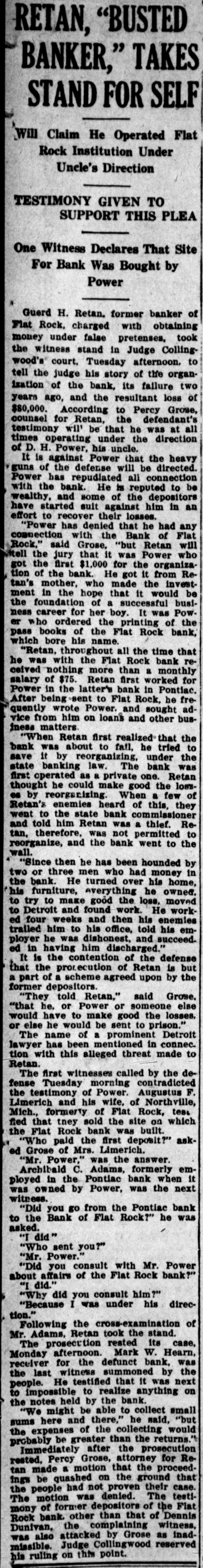 RETAN, "BUSTED BANKER,' " TAKES STAND FOR SELF Will Claim He Operated Flat Rock Institution Under Uncle's Direction TESTIMONY GIVEN TO SUPPORT THIS PLEA One Witness Declares That Site For Bank Was Bought by Power Guerd H. Retan. former banker of Flat Rock, charged with obtaining money under false pretenses, took the witness stand in Judge Collingwood's court, Tuesday afternoon, to tell the judge his story of the organisation of the bank, its failure two years ago, and the resultant loss of $80,000. According to Percy Grose, counsel for Retan, the defendant's testimony will be that he was at all times operating under the direction of D. H. Power, his uncle. It is against Power that the heavy guns of the defense will be directed. Power has repudiated all connection with the bank. He is reputed to be wealthy, and some of the depositors have started suit against him in an effort to recover their losses. "Power has denied that he had any connection with the Bank of Flat Rock," said Grose, "but Retan will tell the jury that it was Power who got the first $1,000 for the organization of the bank. He got it from Retan's mother, who made the investment in the hope that It would be the foundation of a successful business career for her boy. It was Pow. er who ordered the printing of the pass books of the Flat Rock bank, which bore his name. "Retan, throughout all the time that he was with the Flat Rock bank received nothing more than a monthly salary of $75. Retan first worked for Power in the latter's bank in Pontiac. After being sent to Flat Rock, he frequently wrote Power. and sought advice from him on loans and other business matters. "When Retan first realized that the bank was about to fail, he tried to save it by reorganizing, under the state banking law. The bank was first operated as a private one. Retan thought he could make good the losses by reorgarizing. When a few of Retan's enemies heard of this, they went to the state bank commissioner and told him Retan was a thief. Retan, therefore, was not permitted to reorganize, and the bank went to the wall. "Since then he has been hounded by two or three men who had money in the bank. He turned over his home, his furniture, everything he owned. to try to make good the loss, moved to Detroit and found work. He worked four weeks and then his enemies trailed him to his office, told his employer he was dishonest, and succeeded in having him discharged." It is the contention of the defense that the prodecution of Retan is but a part of a scheme agreed upon by the former depositors. "They told Retan," said Grose. "that he, or Power or someone else would have to make good the losses, or else he would be sent to prison." The name of a prominent Detroit lawyer has been mentioned in connection with this alleged threat made to Retan. The first witnesses called by the defense Tuesday morning contradicted the testimony of Power. Augustus F. Limerich and his wife, of Northville, Mich., formerly of Flat Rock, test fied that tney sold the site on which the Flat Rock bank was built. "Who paid the first deposit?" asked Grose of Mrs. Limerich. "Mr. Power," was the answer. Archibald C. Adams, formerly employed in the Pontiac bank when it was owned by Power, was the next witness. "Did you go from the Pontiac bank to the Bank of Flat Rock?" he was asked. "I did" "Who sent you?" "Mr. Power." "Did you consult with Mr. Power about affairs of the Flat Rock bank?" "I did." "Why did you consult him?" "Because I was under his direction." Following the cross-examination of Mr. Adams, Retan took the stand. The prosecution rested its case, Monday afternoon. Mark W. Hearn, receiver for the defunct bank, was last witness summoned by the the people. He testified that it was next to impossible to realize anything on the notes held by the bank. "We might be able to collect small here and there," he said, "but sums expenses of the collecting would probably the be greater than the returns." Immediately after the prosecution rested, Percy Grose, attorney for Remade a motion that the proceedings tan be quashed on the ground that the people had not proven their case. The motion was denied. The testi- Flat of former depositors of the mony bank. other than that of Dennis Rock Dunivan, the complaining witness, also attacked by Grose as inadmissible. was Judge Collingwood reserved