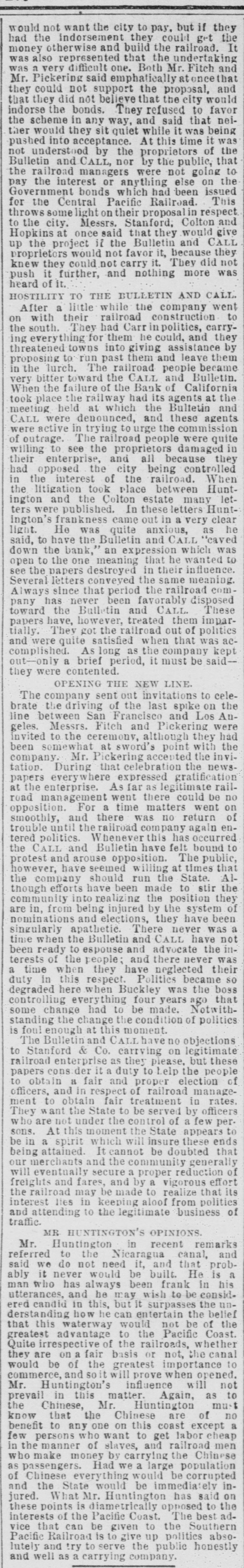 street in front of the bank became a dense mass of people, through whom terror-stricken depositors forced their way. By sympathy the run extended to the smaller banks, and one by one they closed their doors. Latham, the manager of the Bank of London and San Francisco, tried to save Ralston. All the spare coin in his bank was carted up to the side entrance of the Bank of California, and almost as fast as it came in at the side door it went out at the front. The paying teller had orders to continue while there was anvthing to pay with. When half past 2 o'clock came, and payments were still being made, the excitement was intense, and bets were freely made that the bank would stand the pressure. The paying tellers were nervous with excitement as the long hand of the clock slowly climbed around. Five minutes, ten minutes, fifteen minutes. It only wanted a quarter to 3 when the ponder ous doors of the bank were seen to swing outward and close with a mighty clang in the face of the vast crowd that thronged the street. The Bank of California, the greatest financial institution on the Pacific Coast, had ceased to exist. The people went wild. All the evening papers got out extras. In the bank parlor Ralston received the reporters and correspondents, of whom there was a perfect mob. He was ghastly pale, and leaned with his elbow on the mantelpiece. "The Bank of California, gentlemen", he said, "does not owe a single dollar it cannot pay. An attempt has been made to crush me, but it will not succed. The bank will resume in a day or two," This was about 4 p. m. A little after 5 p.m. his lifeless body was taken out of North Beach, and it was known that he had committed suicide. He had ostensibly gone in to take a swim, and although there never was a doubt in the public mind that he had taken his own life. the coroner's jury found an open verdict. The public excitement now grew to fever heat. The friends of Ralston were loud in their denunciations of the Bonanza people and of the Call and Bulletin. The editorial rooms of both papers were barricaded with piles of paper. behind which were hidden some armed police officers. The militia were called out and held in readiness at their armories. The police charged several mobs who assembled to gut the offices. Reporters for these papers held their lives in their hands. A mass-meeting was held at Union Hall, to sympathize with the family of the "murdered Ralston." It was attended by thousands, and addressed by leading men of parties. Colonel W. H. L. Barnes, the attorney to the bank, and a personal friend of the dead man, begged the people for his sake to be quiet and not to disgrace his name by riot. Things simmered down a little, and better counsel began to prevail. Those who witnessed the funeral of Ralston will hardly forget it. Never had such an imposing sight been seen n California. The cortege was preceded by a battalion of cavalry and three regiments of infantry, with arms reversed. Then came the order of Odd Fellows, then the clergy of various denomis ations, then the hearse and pall-bearers, among whom were Senator Sharon, P. 0. Mills, Peter Donahue, the banker; D. is. Colton, the railroad magnate; Judge Hoffman, of the United States Court, and some twenty other equally prominent citizens. Behind the hearse" walked the clerks of the Bank of California, the regents and faculty of the University. the members of the Chamber of Commerce, the membe:s of the Stock Exchange, and of the Pacific Stock Exchange. representatives of the press. trade organizations and citizens in thousands on foot and in carriages. Was there ever seen in the world such a sight?-Comment and Dramatic Times.