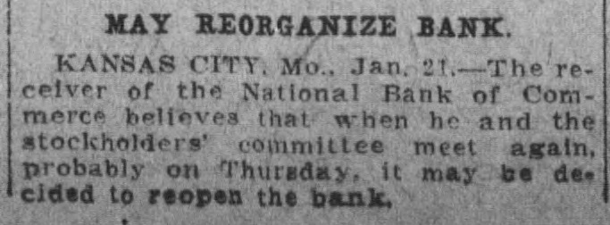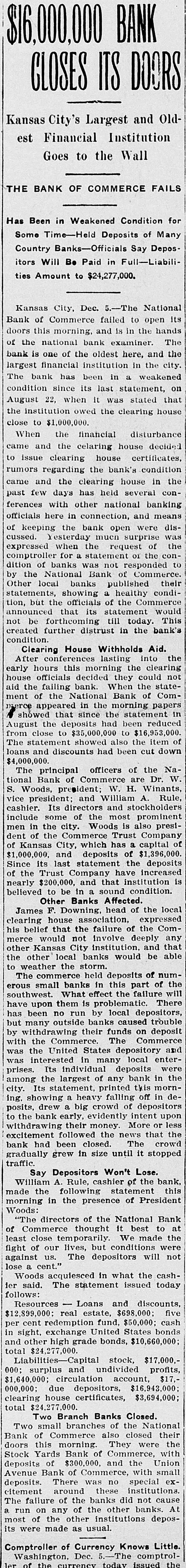 $16,000.000 BANK CLOSES TS DOORS Kansas City's Largest and Oldest Financial Institution Goes to the Wall THE BANK OF COMMERCE FAILS Been in Weakened Condition Many for Has Some Time Deposits of DeposCountry Banks-Officials Say itors Will Be Paid in Full-Liabilities Amount to $24,277,000. Kansas City, Dec. 5.-The National open its of Commerce failed to the hands Bank this morning and is in The doors the national bank examiner. and the of one of the oldest here, the financial weakened bank largest is institution in city. bank has been in a on condition The since its last statement, stated that 22, when it was house the August institution owed the clearing close to $1,000,000. the financial disturbance When and the celaring house certificates, decided came issue clearing house condition to regarding the bank's in the rumors and the clearing house several concame few days has held banking past with other national means ferences here in connection, and disofficials the bank open surprise were was of keeping esterday muen of the cussed. the request for a responded to expressed comptroller when was statement not or the conby dition of banks Bank of Commerce. the National published their Other local showing banks a healthy Commerce condi| statements, the officials of the would tion, but statement announced that its till today. This further created not be forthcoming distrust in the bank's the condition. House Withholds into Aid. Clearing lasting clearing After hours conferences this morning the could not officials When the house Comaid early the failing National bank. decided Bank they of statement of the in the morning papers in merce that since the been reduced showed appeared deposits had statement $16,953,000. August close the to $35,000,000 to the item of from showed also down The loans and statement discounts had been cut Na the The Commerce are tional $4,000,000. Bank principal of officers W. H. of Winants Dr. W. Woods, president William A. Rule, Its most prominent cashier. vice S. president; some directors of and the and stockholders also presiinclude the city. Woods Trust is Company dent of the has a capital men of Kansas in City, Commerce which of $1,396,000. of $1,000,000, and deposits the deposits statement increased the Trust Company institution is believed nearly Since of its $200,000, to last be in and a sound that Affected. have condition. clearing Other F. Downing, Banks head of expressed the local James house association of the Commerce that his belief would that City not the institution. failure involve deeply and be able any other Kansas local banks would to weather held deposits num- the the other commerce the storm. part of of The small banks in this failure will southwest. have erous upon them What is effect by problematic. local the depositors, There run trouble has been outside no banks caused deposit but withdrawing many their funds The on Commerce by Commerce. and with the States depository was interested deposits were the was the Its United individual in many local bank enter- in prises. the largest of any this mornamong printed decity. Its heavy falling the ing. showing statement, a a big crowd of depositors off in posits bank drew early, evidently More intent or upon less I withdrawing to their money the news that the excitement followed closed. The crowd gradually bank had grew been in size until it stopped traffic Depositors Won't Lose the Say A. Rule, cashier of bank, this morning made William the in following the presence statement of President Woods: directors of the National to Bank at "The Commerce thought it best made the of least close temporarily but conditions We were against lose fight of our us. lives, The depositors will not ier cent.' acquiesced in what the today cashWoods said. The statement issued follows: - Loans and discounts, five Resources real estate, $698,000: cash $12,899,000; redemption fund, $50,000; States bonds per cent exchange United and in sight, other high grade bonds, $10,660,000; surplus total Liabilities-0 $24,277,000. and undivided stock, $17,000. profits, $17, account, 000; circulation $1,640,000; depositors, $16,943,000 000,000; clearing house due certificates, $3,694,000; total $24,277,000. Branch Banks Closed. National Two small branches of the closed their Two also the with doors Bank of this Yards Commerce morning. Bank of Commerce, They were Union Stock of $300.00 and the with small deposits Bank of Commerce, special exdeposits. Avenue There was these no institutions. citement around the banks did not cause At The failure of the other banks. run on any other of institutions deposmost of the usual. its were made as Little Comptroller of Currency Knows comptrolWashington, Dec. 5.-The today issued the ler of the currency