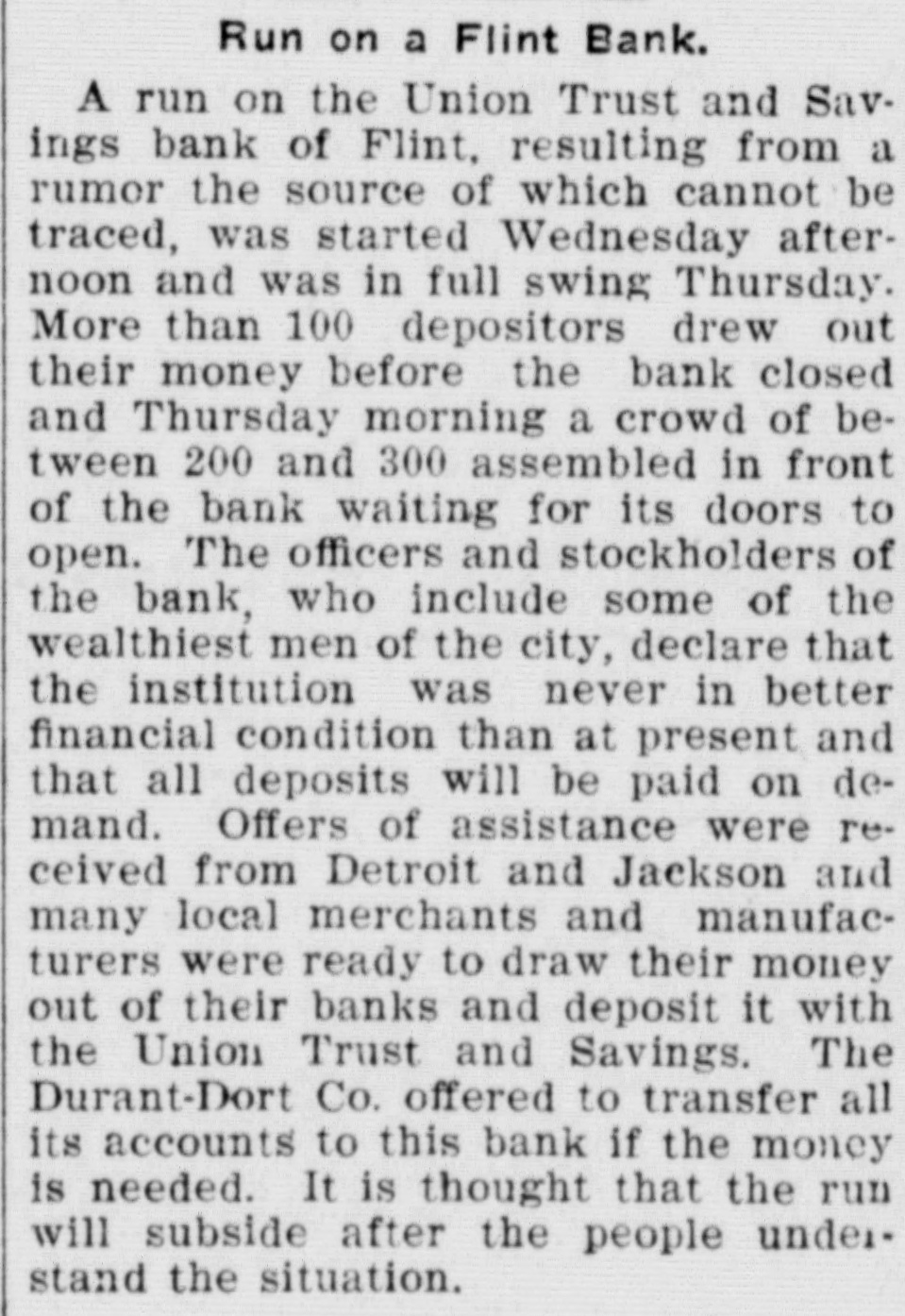 Run on a Flint Bank. A run on the Union Trust and Savings bank of Flint, resulting from a rumor the source of which cannot be traced, was started Wednesday afternoon and was in full swing Thursday. More than 100 depositors drew out their money before the bank closed and Thursday morning a crowd of between 200 and 300 assembled in front of the bank waiting for its doors to open. The officers and stockholders of the bank, who include some of the wealthiest men of the city, declare that the institution was never in better financial condition than at present and that all deposits will be paid on demand. Offers of assistance were received from Detroit and Jackson and many local merchants and manufacturers were ready to draw their money out of their banks and deposit it with the Union Trust and Savings. The Durant-Dort Co. offered to transfer all its accounts to this bank if the money is needed. It is thought that the run will subside after the people understand the situation.