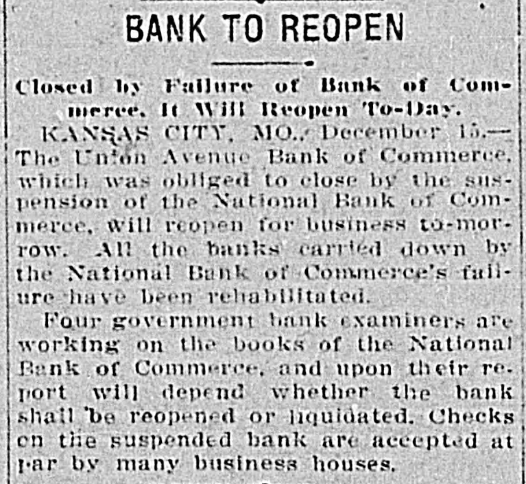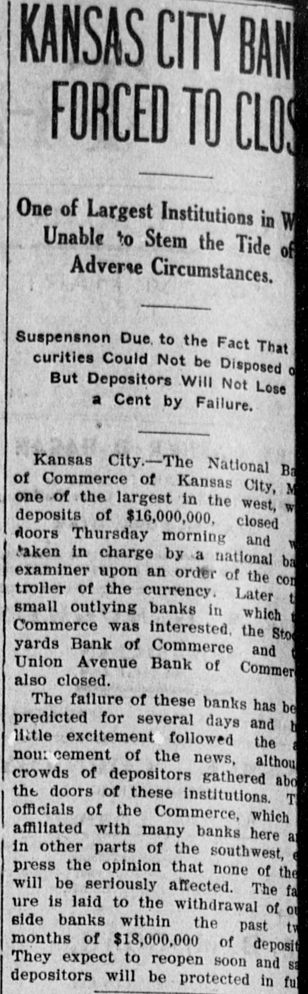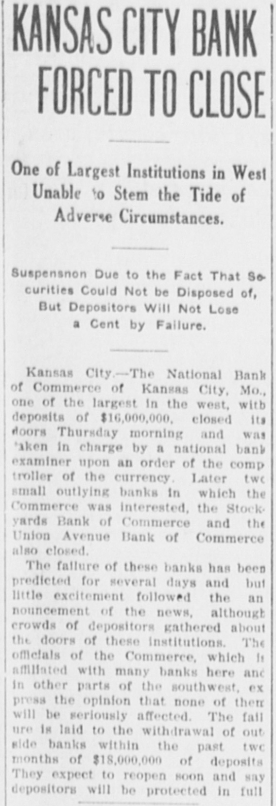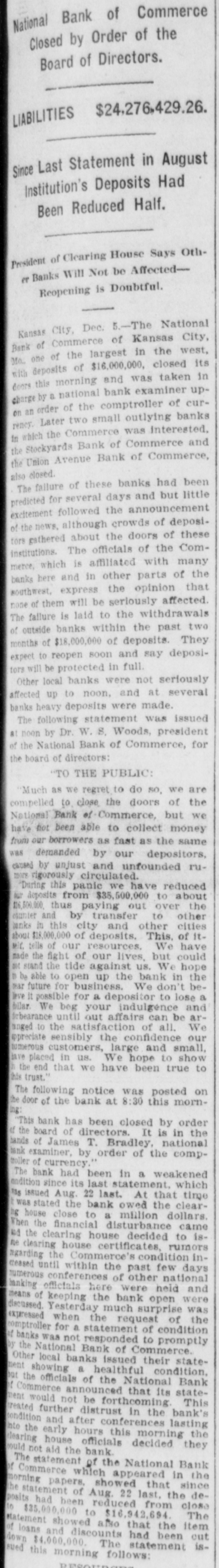 me National Bank or omneice appeared in the morning papers it showed since the statement of Aug. 22 last deposits had been reduced from close to $35,000,000 to $16,953,000. The statement showed also the item of loans and discounts had been cut down $4,000,000. Leading Men Interested. The principal officers of the National S. Bank of Commerce are: Dr. W. Woods, president; W. H. Winants, vice president, and William A. Rule, cashier, Its directors and stockholders include some of the most prominent men in the city. Woods is also president of the Commerce Trust company of Kansas City which nas a capital of $1.000,000 and deposits of $1,396,000. Since its last statement the deposits of the trust company have increased nearly $200,000, and that institution is believed to be in a sound condition. Others Not Affected. James F. Downing, head of the local clearing house association, expressed the belief the failure of the Commerce would not involve deeply any other Kansas City institution, and that the other local banks would be able to weather the storm, The Commerce held the deposits of numerous small banks in this part of the southwest. What effect this failure will have upon them is problematic Outside Banks Cause Trouble. There has been no run by local depositors, but many outside banks caused trouble by withdrawing their funds on deposit with the Commerce. The Commerce was a United States depository and was interested in many local enterprises. Its individual depositors were among the largest of any bank in the city. Its statement printed this morning showing a heavy falling off in deposits drew a big crowd of depositors to the bank early, evidently intent upon drawing their money. More or less excitement followed the news that the bank had Deen closed, and the crowd gradually grew in size until it stopped traffic. Cashier Makes Statement. William A. Rule, cashier of the bank, made the following statement this morning in the presence of President Woods and two directors: Name National Bank-ofCommerce thought it best to at least close temporarily We made the fight of our lives, but conditions were against us. Depositors will not lose a cent." Woods acquiesced in what the cash ier said, Statement as Published. The statement issued today follows: I Resources - Loans and discounts $12,899,000; real estate, $689,000; 5 per cent redemption fund, $50,000; cash, sight exchange, United States bonds, and other high grade bonds, $10,630, 000. Total, $24,277,000. D Liabilities-Capital stock. $1,000,000; surplus and undivided profits, $1,640, 000; circulation account, $1,000,000; d due depositors, $16,943,000; clearing house certificates, $3,694,000. Total $24,277,000. Two Branches Shut Doors. Two small branches of the National rBank of Commerce also closed their to doors this morning. They were the al Stock Yards Bank of Commerce, det. posits of $300,000, and the Union Avenue Bank of Commerce, with small n deposits. There was no especial exat citement around these institutions The failure of the banks failed to cause y a run on any of the other banks and on at most of the other institutions de SS posits were made as usual. Another Small One Caught. Kansas City, Mo., Dec. 5.-The State d Bank of Argentine, a Kansas City su eburb. with small deposits, closed its ordoors early this afternoon following run. The stock of the bank was to at owned principally by the Nationa Bank of Commerce of Kansas City. erChicago Banks Debtors. reChicago, Ill., Dec. 5.-President For ial gan, chairman of the Chicago clearing house committee, said the failure o es, re the no would Kansas have City effect Bank upon of Commerce Chicago banks for the reason Chicago bank: with which it has accounts are al 1ddebtors to the Kansas City institution nd th Has Deposits in New York. at New York, Dec. 5.-The New Yor am correspondent of the National Bank o beCommerce of Kansas City is the Firs National bank. An official of that in lly uld stitution said today the Kansas Cit bank had a large credit balance wit Ily the First National. The stock marke in was affected by news of the failure but not to a serious extent. as lue Does Not Change Rate. ayLondon, Dec. 5.-The rate of discour of of the Bank of England remained un of changed today at 7 per cent. New England Factories Reopen. Boston, Dec. 5.-Signs of recover the from the business depression whic en started several weeks ago are bein unin of New England b