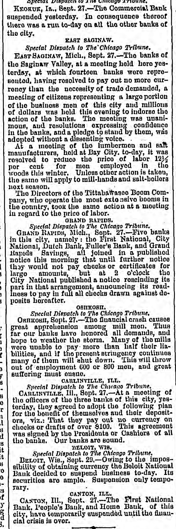 Special Dispatch to The Cincago Thound. KEOKUK, In.. Sept. 27.-The Commercial Bank suspended yesterday. In consequence thereof there was a. run to-day on all the other banks of the city. EAST SAGINAW. Special Dispatch to The Chicago Tribune. EAST SAGINAW, Mich., Sept. 27.-The banks of the Saginaw Valley, at a meeting hold hero yesterday, at which fourteen banks were represonted, having resolved to pay out no more curroncy than the necessity of trade demanded, a meeting of citizens representing a largo portion of the business mon of this city and millions of dollars was held this ovening to indorse the action of the banks. The meeting was unanimous, and resolutions expressing confidence in the banks, and a pledge to stand by them, was adopted without a diesenting voice. At a meeting of the lumbermon and BATT manufacturers, held at Bay City. to-day, it was resolved to reduce the price of labor 121/2 por cent for mon employed in the woods this winter. Unless other action is taken, the same will apply to mill-hands and salt-boilera next season. The Directors of the Tittabattageo Boom Company, who operato the most exto nsivo booms in the country, took the same action at a meeting in regard to the price of labor. GRAND RAPIDS. Special Dispatch to The Chicago Tribune. GRAND RAPIDS, Mich., Sept. 27.-Five banks in this city, namely: the First National, City National, Dutch Bank, Fuller's Bank, and Grand Rapide Savings, all joined in a published notice this morning that until further notice they would not pay checks or certificates for large amounts, but at 2 o'clock the City National published a notice rescinding its part in that arrangement, announcing its roadlness to pay in full all checks drawn against doposits horeafter. OBIHOSIT. Special Dispatch to The Chicago Tribune. ORHKOSI, Sept. 27.-The financial crash causes great apprehension among mill mon. Thus far our banks have honored all domands, and hope to weather the storm. Many of the milla were unable to pay more than half their liabilities, and if the present stringency continues many of thom will shut down. This will throw out of employment 600 or 800 men, and great sufforing must ensue. CARLINVILLE, ILL. Special Dispatch to The Chicago Tribune. CARLINVILLE, III., Sept. 27.-At a meeting of 8 the officers of the three banks of this city, yese terday, they agreed to adopt the following plan r for the bonefit of themsolves and their depositn ors, viz.: That they pay out no currency on 1 checks or drafts of over $100. This agreement was signed by the Presidents or Cashiers of all the banks. Our banks are sound. DELOIT, WIB. Special Dispatch to The Chicago Tribune. BELOIT, Wis., Sept. 29.-Owing to the impossibility of obtaining currency the Boloit National o Bank decided to suepend business to-day. Its 0 securities are ample. Susponsion only tomporary. is CANTON, ILL. of CANTON, Ill., Sept. 27.-The First National y Bank. l'eople's Bank, and Home Bank, of this city, have temporarily suspended until the fiuaucial crisis is over. 3.