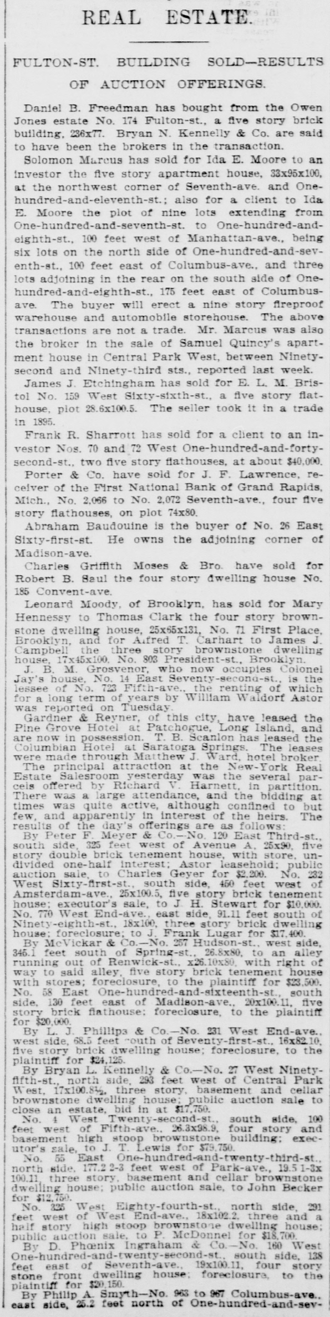 REAL ESTATE. # FULTON-ST. BUILDING SOLD-RESULTS # OF AUCTION OFFERINGS. Daniel B. Freedman has bought from the Owen Jones estate No. 174 Fulton-st., a five story brick building, 236x77. Bryan N. Kennelly & Co. are said to have been the brokers in the transaction. Solomon Marcus has sold for Ida E. Moore to an investor the five story apartment house, 33x95x100, at the northwest corner of Seventh-ave. and One- hundred-and-eleventh-st.; also for a client to Ida E. Moore the plot of nine lots extending from One-hundred-and-seventh-st. to One-hundred-and- eighth-st., 100 feet west of Manhattan-ave., being six lots on the north side of One-hundred-and-sev- enth-st., 100 feet east of Columbus-ave., and three lots adjoining in the rear on the south side of One- hundred-and-eighth-st., 175 feet east of Columbus- ave. The buyer will erect a nine story fireproof warehouse and automobile storehouse. The above transactions are not a trade. Mr. Marcus was also the broker in the sale of Samuel Quincy's apart- ment house in Central Park West, between Ninety- second and Ninety-third sts., reported last week. James J. Etchingham has sold for E. L. M. Bris- tol No. 159 West Sixty-sixth-st., a five story flat- house, plot 28.6x100.5. The seller took it in a trade in 1895. Frank R. Sharrott has sold for a client to an in- vestor Nos. 70 and 72 West One-hundred-and-forty- second-st., two five story flathouses, at about $40,000. Porter & Co. have sold for J. F. Lawrence, re- ceiver of the First National Bank of Grand Rapids, Mich., No. 2,066 to No. 2,072 Seventh-ave., four five story flathouses, on plot 74x80. Abraham Baudouine is the buyer of No. 26 East Sixty-first-st. He owns the adjoining corner of Madison-ave. Charles Griffith Moses & Bro. have sold for Robert B. Saul the four story dwelling house No. 185 Convent-ave. Leonard Moody, of Brooklyn, has sold for Mary Hennessy to Thomas Clark the four story brown- stone dwelling house, 25x65x131, No. 71 First Place, Brooklyn, and for Aifred T. Carhart to James J. Campbell the three story brownstone dwelling house, 17x45x100, No. 803 President-st., Brooklyn. J. B. M. Grosvenor, who now occupies Colonel Jay's house, No. 14 East Seventy-second-st., is the lessee of No. 723 Fifth-ave., the renting of which for a long term of years by William Waldorf Astor was reported on Tuesday. Gardner & Reyner, of this city, have leased the Pine Grove Hotel at Patchogue, Long Island, and are now in possession. T. B. Scanlon has leased the Columbian Hotel at Saratoga Springs. The leases were made through Matthew J. Ward, hotel broker. The principal attraction at the New-York Real Estate Salesroom yesterday was the several par- ceis offered by Richard V. Harnett, in partition. There was a large attendance, and the bidding at times was quite active, although confined to but few, and apparently in interest of the heirs. The results of the day's offerings are as follows: By Peter F. Meyer & Co.-No. 120 East Third-st., south side, 325 feet west of Avenue A, 25x90, five story double brick tenement house, with store, un- divided one-half interest; Astor leasehold; public auction sale, to Charles Geyer for $2,200. No. 232 West Sixty-first-st., south side, 450 feet west of Amsterdam-ave., 25x100.5, five story brick tenement house; executor's sale, to J. H. Stewart for $10,000. No. 770 West End-ave., east side, 91.11 feet south of Ninety-eighth-st., 18x100, three story brick dwelling house; foreclosure; to J. Frank Lugar for $17,400. By McVickar & Co.-No. 257 Hudson-st., west side, 345.1 feet south of Spring-st., 26.8x80, to an alley running out of Renwick-st., x26.10x80, with right of way to said alley, five story brick tenement house with stores; foreclosure, to the plaintiff for $23,500. No. 58 East One-hundred-and-sixteenth-st., south side, 130 feet east of Madison-ave., 20x100.11, five story brick flathouse; foreclosure, to the plaintiff for $20,000. By L. J. Phillips & Co.-No. 231 West End-ave., west side, 68.5 feet south of Seventy-first-st., 16x82.10, five story brick dwelling house; foreclosure, to the plaintiff for $24,125. By Bryan L. Kennelly & Co.-No. 27 West Ninety- fifth-st., north side, 293 feet west of Central Park West, 17x100.8½, three story, basement and cellar brownstone dwelling house; public auction sale to close an estate, bid in at $17,750. No. 4 West Twenty-second-st., south side, 100 feet west of Fifth-ave., 26.3x98.9, four story and basement high stoop brownstone building; exec- utor's sale, to J. T. Lewis for $79,750. No. 55 East One-hundred-and-twenty-third-st., north side, 177.2 2-3 feet west of Park-ave., 19.5 1-3x 100.11, three story, basement and cellar brownstone dwelling house; public auction sale, to John Becker for $12,750. No. 325 West Eighty-fourth-st., north side, 291 feet west of West End-ave., 18x102.2, three and a half story high stoop brownstone dwelling house; public auction sale, to P. McDonnel for $18,700. By D. Phœnix Ingraham & Co.-No. 160 West One-hundred-and-twenty-second-st., south side, 138 feet east of Seventh-ave., 19x100.11, four story stone front dwelling house; foreclosure, to the plaintiff for $20,150. By Philip A. Smyth-No. 963 to 967 Columbus-ave., east side, 25.2 feet north of One-hundred-and-sev-