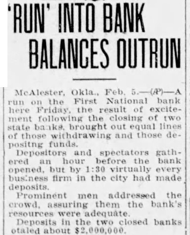 Run triggered by suspension of the Commercial Bank in the city, producing runs on other banks including First National.