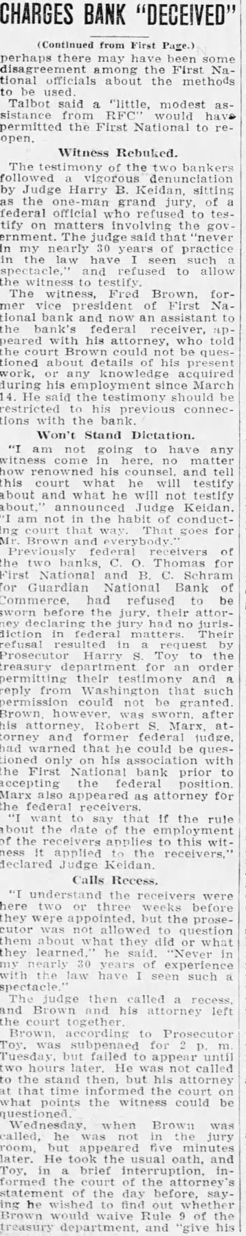 CHARGES BANK "DECEIVED" from First Page.) there may among the First National officials about the used Talbot "little, modest aspermitted the First National open. Witness Rebuked. The the bankers followed by Judge Harry Keidan, the grand federal official refused testify the law seen such and to allow the witness to Brown, forFirst tional an assistant federal peared his who the Brown could questioned details his present work, during his March the testimony be his previous connections Won't Stand Dictation. going to have any no matter and tell this testify about and testify about, Judge Keidan. not the habit court That for National and Schram National Bank refused before the declaring had no refusal Harry Toy the treasury for an order their testimony and reply Washington that such not after torney former federal warned that he could be questioned his association with bank prior as attorney for the federal that If the rule the of the the receivers to the Judge Calls Recess. were appointed. but the proseabout what they did or what experience the have such spectacle judge called recess, and Brown his left together Brown. according Prosecutor failed called to stand then, but attorney what points the witness could Brown was called, room, but five minutes later. He took usual and Toy, brief interruption, formed the of the attorney the day ing he find out of treasury department, and "give