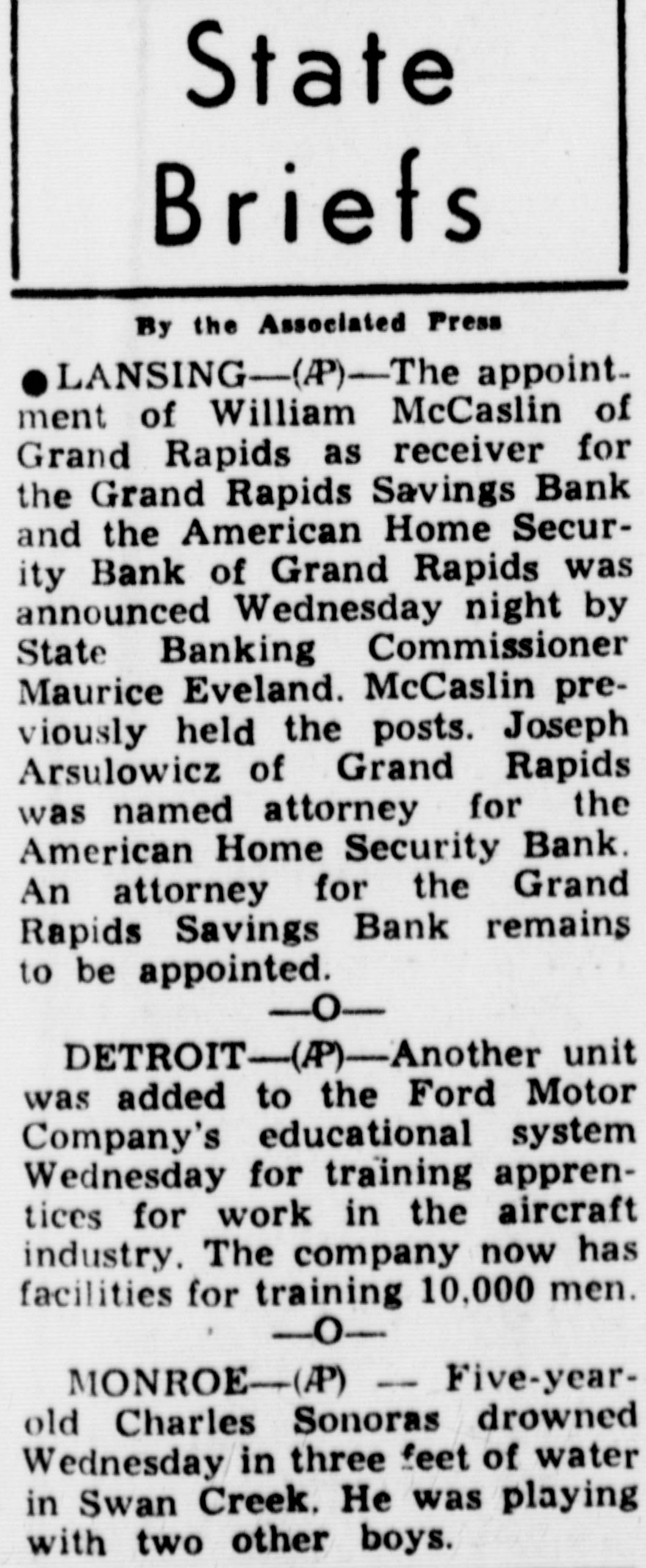 State Briefs By the Associated Press LANSING-(P)-The appointment of William McCaslin of Grand Rapids as receiver for the Grand Rapids Savings Bank and the American Home Security Bank of Grand Rapids was announced Wednesday night by State Banking Commissioner Maurice Eveland. McCaslin previously held the posts. Joseph Arsulowicz of Grand Rapids was named attorney for the American Home Security Bank. An attorney for the Grand Rapids Savings Bank remains to be appointed. -0DETROIT-(P)-Another unit was added to the Ford Motor Company's educational system Wednesday for training apprentices for work in the aircraft industry. The company now has facilities for training 10,000 men. -0MONROE-(P) - Five-yearold Charles Sonoras drowned Wednesday in three feet of water in Swan Creek. He was playing with two other boys.