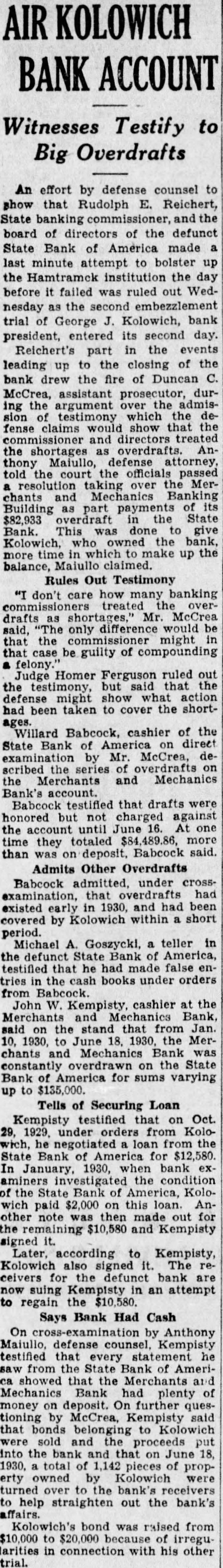 AIR KOLOWICH BANK ACCOUNT Witnesses Testify to Big Overdrafts An effort by defense counsel to show that Rudolph E. Reichert, State banking commissioner, and the board of directors of the defunct State Bank of America made last minute attempt to bolster up the Hamtramck institution the day before it failed was ruled out Wednesday as the second embezzlement trial of George J. Kolowich, bank president, entered its second day. Reichert's part in the events leading up to the closing of the bank drew the fire of Duncan C. McCrea, assistant prosecutor, during the argument over the admission of testimony which the defense claims would show that the commissioner and directors treated the shortages as overdrafts. Anthony Maiullo, defense attorney, told the court the officials passed a resolution taking over the Merchants and Mechanics Banking Building as part payments of its $82,933 overdraft in the State Bank. This was done to give Kolowich, who owned the bank, more time in which make up the balance, Maiullo claimed. Rules Out Testimony "I don't care how many banking commissioners treated the overdrafts shortages,' Mr. McCrea said, "The only difference would be that the commissioner might in that case be guilty of compounding felony.' Judge Homer Ferguson ruled out the testimony, but said that the defense might show what action had been taken to cover the shortages. Willard Babcock, cashier of the State Bank of America on direct examination by Mr. McCrea, described the series of overdrafts on the Merchants and Mechanics Bank's account. Babcock testified that drafts were honored but not charged against the account until June 16. At one time they totaled $84 489.86, more than was on deposit. Babcock said. Admits Other Overdrafts Babcock admitted. under crossexamination, that overdrafts had existed early in 1930, and had been covered by Kolowich within a short period. Michael A. Goszycki, a teller in the defunct State Bank of America, testified that he had made false entries in the cash books under orders from Babcock. John W. Kempisty, cashier at the Merchants and Mechanics Bank, said on the stand that from Jan. 10, 1930, to June 18, 1930, the Merchants and Mechanics Bank was constantly overdrawn on the State Bank of America for sums varying up to $135,000. Tells of Securing Loan Kempisty testified that on Oct. 29, 1929, under orders from Kolowich, he negotiated a loan from the State Bank of America for $12,580. In January, 1930, when bank ex aminers investigated the condition of the State Bank of America, Kolowich paid $2,000 on this loan Another note was then made out for the remaining $10,580 and Kempisty signed it. Later, according to Kempisty, Kolowich also signed it. The receivers for the defunct bank are now suing Kempisty in an attempt to regain the $10,580. Says Bank Had Cash On cross-examination by Anthony Maiullo, defense counsel, Kempisty testified that every statement he saw from the State Bank of America showed that the Merchants and Mechanics Bank had plenty of money on deposit. On further questioning by McCrea, Kempisty said that bonds belonging to Kolowich were sold and the proceeds put into the bank and that on June 18, 1930, total of 1,142 pieces of property owned by Kolowich were turned over to the bank's receivers to help straighten out the bank's Kolowich's bond was raised from $10,000 to $20,000 because of irregularities in connection with his other trial.