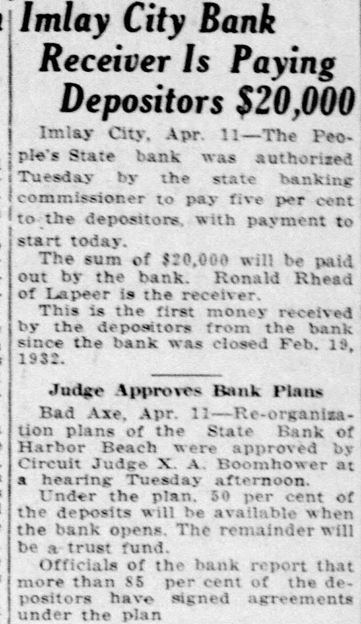 Imlay City Bank Receiver Is Paying Depositors $20,000 Imlay City, Apr. ple's State bank authorized Tuesday by to per cent to the payment to start today. The sum of $20,000 will be paid out by the Ronald Rhead of receiver. This is first money received by the from the bank since the bank was Feb. 19, 1932. Judge Approves Bank Plans Bad Apr. tion plans of the State Bank of Harbor Beach approved Circuit X. at Under the of the deposits be available when the bank opens. The remainder will be trust fund. Officials of the bank report that more than 85 positors have agreements the plan