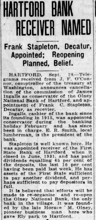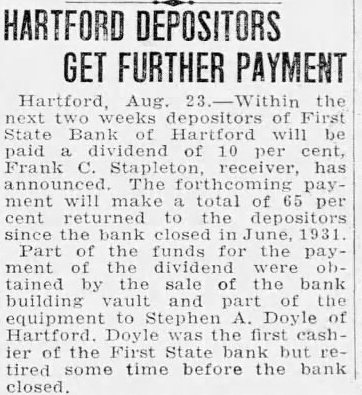 HARTFORD DEPOSITORS GET FURTHER PAYMENT Hartford, Aug. 23.-Within the next two depositors of First State Bank of Hartford will be paid dividend of 10 per cent, Frank C. Stapleton. receiver, has announced The forthcoming pay. ment will make a total of 65 per cent returned to the depositors since the bank closed in June, 1931. Part of the funds for the payment of the dividend were obtained by the sale of the bank building vault and part of the equipment to Stephen A. Doyle of Hartford. Doyle was the first cashier of the First State bank but tired some time before the bank closed.