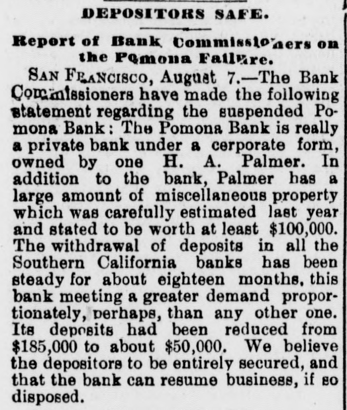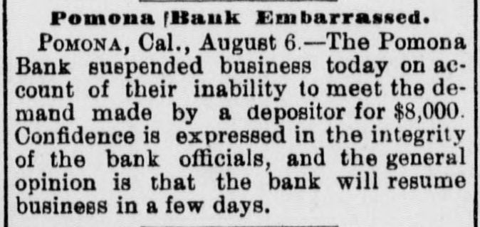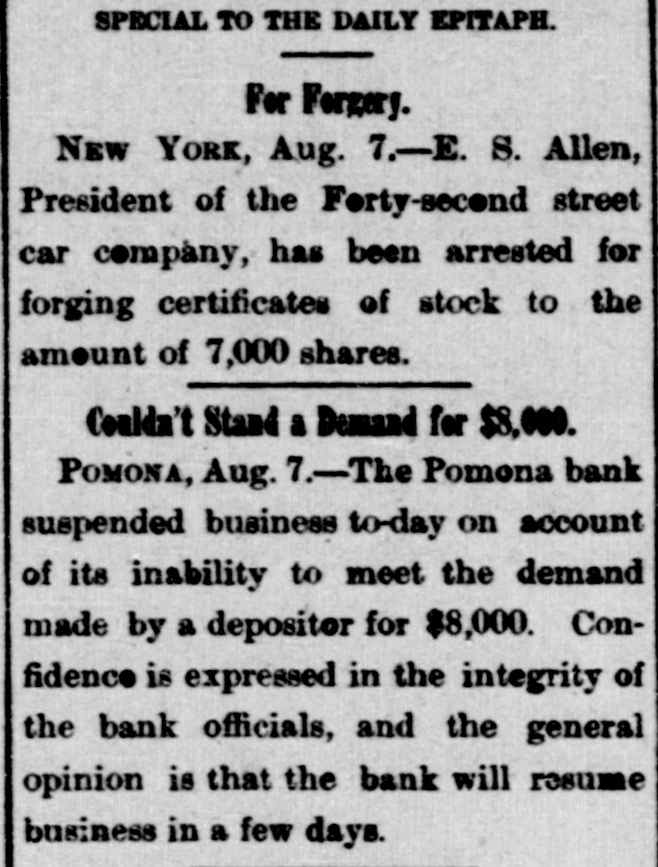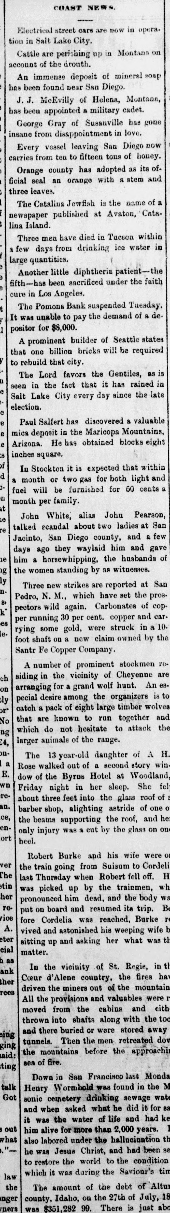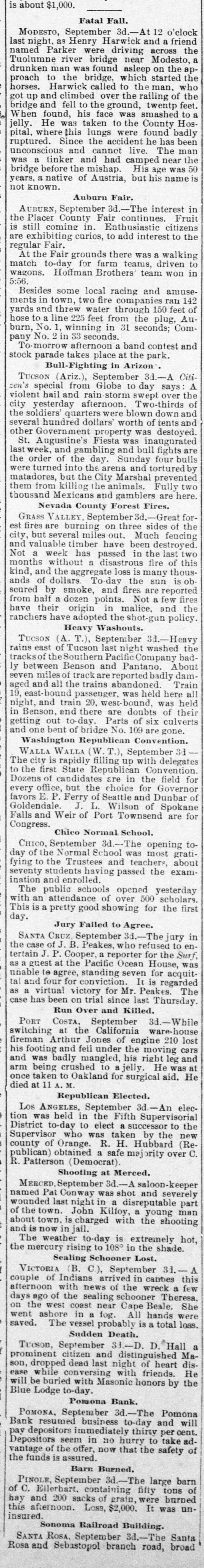 Mystery at Prescott. PRESCOTT (A. T.), August 7th.-D.S. Scoville, a mining man from Chicago, had his throat mysteriously cut about 2 o'clock this morning, while on his way to his room at the hotel. He and a companion and mining partner, named Donnelly, had been making a night of it, visiting the various saloons, and had both accompanied a singer from one of the saloons home. Half an hour later Scoville was heard crying for help, and was found weltering in a pool of blood on the street corner. His wound is serious, but probably not fatal. Donnelly's hand was covered with blood, but neither he nor Scoville remembers anything concerning the affair. The cut in Scoville's throat is three inches long and about an inch and a half deep, and within the sixteenth of an inch of the carotid artery. Great Council of Red Men. SAN FRANCISCO, August 7th.-The Great Council of the Improved Order of Red Men to-day elected the following officers: George H. Buck, of Redwood City, Great Sachem; J. P. Counts, Sacramento, Great Senior Sagamore; Fred Brandt, San Francisco, Great Junior Sagamore; J. J. Buckley, Sacramento, Great Prophet; H. S. Winn, San Francisco, Great Chief of Records (re-elected); Adam Smith, San Francisco, Great Keeper of Wampum (reelected): Henry A. Chase, San Francisco, Great Representative to the Great Council of the United States, for two years; Benjamin F. Josselyn, Davis Lourderback and J. P. H. Wentworth, Great Trustees. Pretty Cute, but Unsuccessful. WALLA Walla (W. T.), August 7th.To-day two prisoners at the Penitentiary attempted to escape from the brick-yard, where four of the convicts were unloading a clay train. They jumped on an engine and. opening the throttle valve, attempted to speed out into the country, where they could have fled to the foothills. But the clay which had fallen between the cars on the track during the process of unloading prevented the cars from moving, and the would-be escapes were captured and returned to their cells. If they had uncoupled the engine before boarding it, the effort to escape might have been successful. Pomona's Bank Suspends. POMONA, August 7th.-The Pomon Baank closed its doors yesterday morning and suspended business. Cause, demand of depositor Louis Phillips for the amount of his claim of $8,000, which the bank was unable to meet. The last quarterly report of the bank shows the amount of cash on hand less than $7,000. Due depositors and other banks, over $100,000. President H. A. Palmer says the bank will resume in a few days. Palmer claims that the reason of failure is non-payment of over-due notes, which the bank failed to press. Glad to Get Back. MARYSVILLE, August 7th.-A family of emigrants in two wagons passed through Marysville to-day from Oregon. They left California five years ago, and have not since stopped in one place more than six months at a time. They found no country equal to California, and are glad to get back. Drowned at Ocean Beach. SAN DIEGO, August 7th.-Eugene Learn and a friend, whose name is unknown, were drowned at Ocean Beach to-day by the capsizing of a boat. The bodies have not been recovered. Learn leaves a wife and three children at Roseville. Don't Like the Idea. SAN FRANCISCO, August 7th.-The proposition made by Dr. Ayers to establish and maintain a Home for Indigent Pioneers does not meet with favor with the members of the Pioneer Society, who say they do not wish to establish an almshouse for unfortunate old-timers. An Extended Vacation. Los ANGELES, August 7th.-Brady, the accomplice of Jordan in the murderous assault on and robbery of Mrs. Cuddeback, was sentenced to-day to eight years in San Quentin. Jordan, who led in the job, was sent to Folsom for twenty years. Senator Stanford's Horses. SAN FRANCISCO, August 7th.-It is reported that Senator Stanford will remove all of his horses from Palo Alto to Pleasanton, because they do not do as well at the former place as they ought to. Fire at Marysville. MARYSVILLE August 7th.-A fire to day destroyed the frame residence of John Pepper, opposite the plaza. Lose, $2,000; partly insured. The fire caught from a de fective slovepipe.
