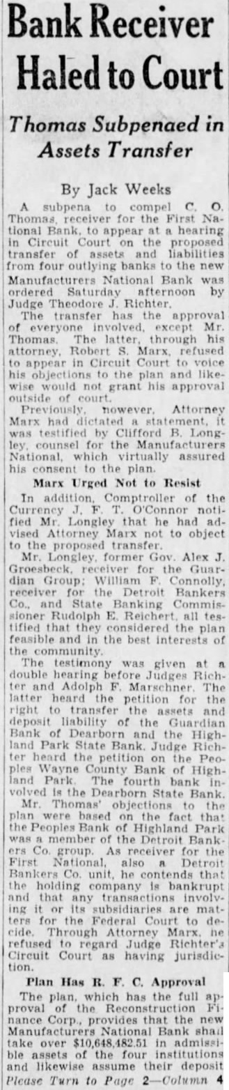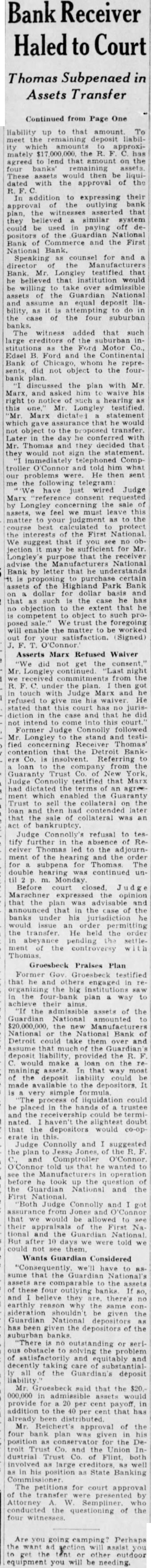 Number Two Continued from Page 1. ed Judge Keidan. Kanzler. "It has never been questioned. The corporation was organized in 1929 to deal in securities and that loan was made in time was as high as 000. has reduced to this amount. There was collateral on the loan and we indorsed it only when collateral did not present sufficient margin. The loan was approved by the bank's execcommitee.' Kanzler said the bank examiners never criticized the loan, but said he "supposed there is no question" that some of the loans of directors were Argument for Loan. Returning discussion of the Guardian units, Kanzler said one argument for loan was that would chain banks able to face almost any situation. "Our purpose was to strengthen them because they had competitor banks which were comparatively weak, he "In January our Port Huron bank faced substantial run bank across the street named the United States National bank had difficulty. would not have withstood that if it was not good. There is danger in banking group that one unit may get into difficulties and hurt the rest, so ve wanted them all strong as We could get them. At the time the loan was sought from the R. said Kanzler, the Guardian National Bank of was 41 per liquid, the Highland Park bank was 24 cent liquid. the Grand Rapids bank 30 per cent. Jackson Saginaw Flint 19. Port Huron 32 before the run which he mentioned 20, Battle Creek 35, Dearborn Royal Oak 87. Ionia 32, Niles 47, Trenton 10 and Hamtramck 44. "Did you ever ask the federal men why they opened other units and did not open the Guardian bank here it had liquidity of 41 per O'Hara asked. "Washington insisted that the Guardian bank and First National bank have be treated alike," said Kanzler able find out the reason for that attitude which they began to express as soon as the holiday was declared. of fact," O'Hara, "all but one of the National banks in your group which they permitted to reopen were less liquid than the Guardian bank here, weren't they the witness. "They opened the banks at Port Huron, and Creek, which were less liquid. They also opened the state banks at Highland Park and Dearwhich were less liquid. Kanzler discussing events leading up the refusal the R. loan. said he "had no question but what the loan made. He said to cover the quested, assets of face value of were selected collateral, and total of $330,000. worth of assets were available to pick Murfin Testifies. James former circuit judge bank attorney. today told the jury that days after calling of the Michigan bank hollday he was told by Mills. then secretary of the Treasury. that the First Bank Detroit was solvent and should not have been closed. Murfin also said a plan is making in which depositors of the First National would be paid 100 cents the dollar once. He declined make details of the plan public, saying that publicity would ruin Murfin's testimony followed that of Kanzler Under questioning rosecutor Harry Toy. he said was in Washington few days aft the holiday and was asked by bank associates in Detroit conwith Mills. and find out what the Treasury wished do in Detroit situation. He said he conferred for an hour Saturday. Feb. The banks did not open on the morning of Feb. told the secretary that had the closing the First National said told him following the closing. due to holiday. had urged the bank's board of directors to. reopen the bank arbitrarily and permit limited withdrawals. "That good why didn't they do it?' Mills to told him." continued Murfin, "that his agent, Leyburn (Alfred chief examiner for the Federal in this district) had declared the First National insolvent. had no right to do that, Mills Your bank solvent Had been insolvent. it would been my duty to have put in receiver only had the right to say whether or it was solvent' "Terrible Mistake." Murfin previously said he opposed the state bank holiday strongly. and declared he believed it was terrible mistake. He, said he was present the meeting the decision was made to banks. and was the only one to vote The witness further said that of not only sclosed no inkling of First insolvency in the National but, on the contrary. showed it was "making strong headway. said he was so convinced the strength of of the growing bank that, within the months previous to the closing. he bought 800 of stock. 200 December just before the closing Appeals to President. Lansing, Mich. June The state today had asked PresiRoosevelt to intervene Detroit to aid determining whether banks in closed without justification. Patrick H. O'Brien. attorney general. sent telegram to the Presiednt. stating that witnesses in the Detroit jury banking investigation testified the Guardian National Bank of Commerce and the First National Bank of Detroit are solvent and of paying depositors in full. Gov. Alex Groesbeck. and William F. Connolly receivers for banking offered testimony this groups. effect. Brien informed the President he denied access the comptroller of the books by the His telegram said: "Several of prominence influence in Detroit have testified the national banks now closed and the of govare solvent and of paying their depositors in full. that they should never have closed. that they were closed because or to some ulterior purpose, that the government was responsible for closing them keening closed and that with reasonable assistance from federal authorities either the system or the Reconstruction Finance tion these two great banking institutions could be reopened. Brien's telegram read. "We have asked for the cooperaof federal authorities towitthe Treasury department and the comptroller of the currency in ord er that we might the books and records of banks. and from the testimony of nesses having access to said books the exact facts The of the has refused on legal grounds to permit us access to the books and We have not received reply from the Treasury department. "The have been subpenaed but have declined to testify on the ground the state has no jurisdiction. it 