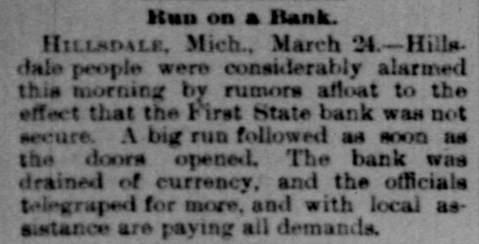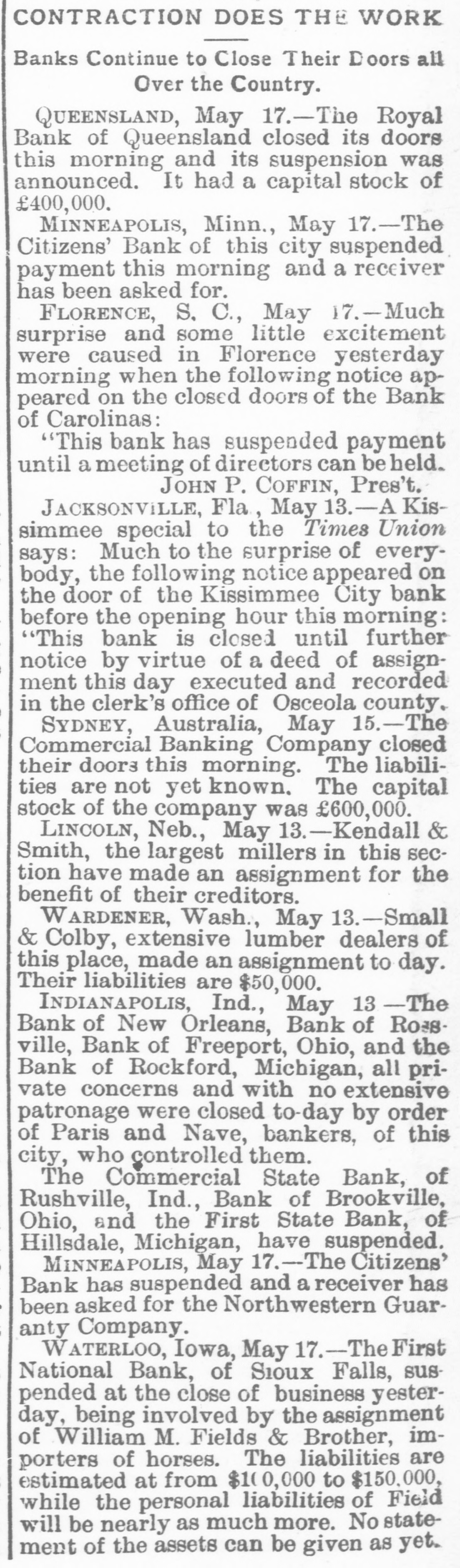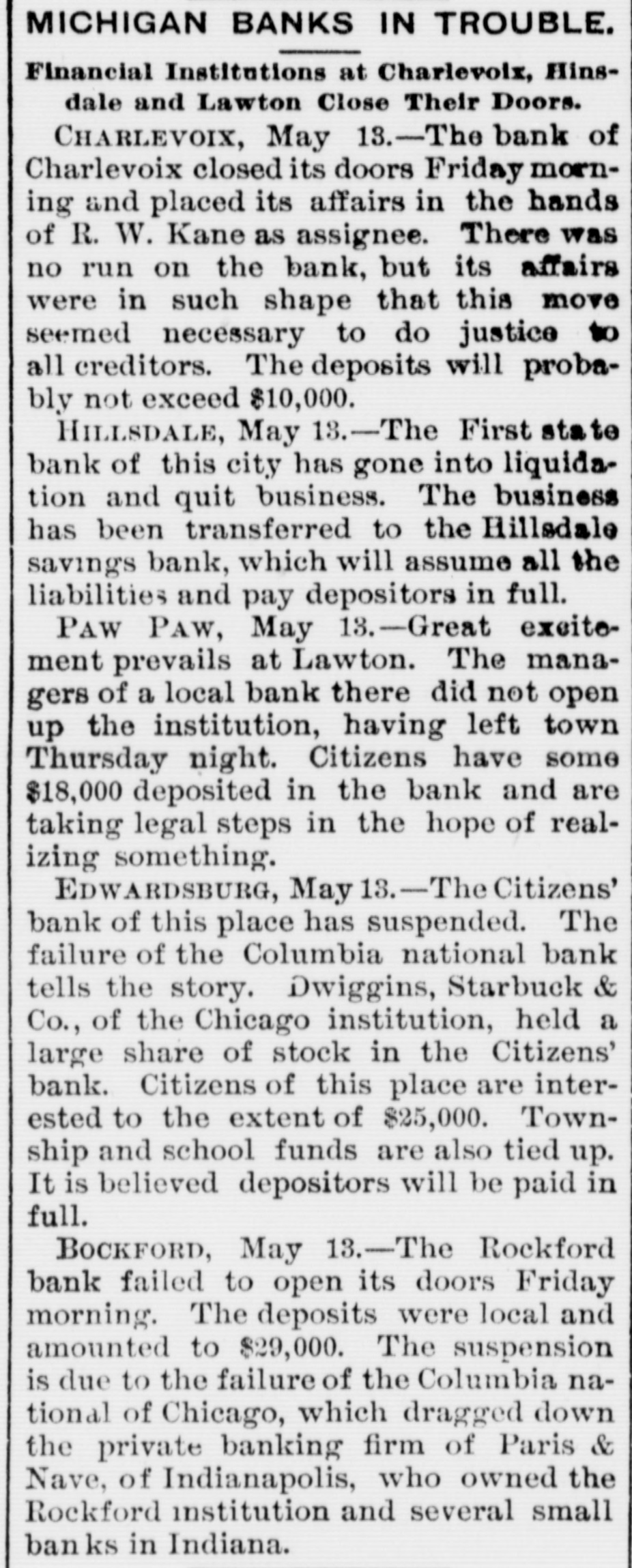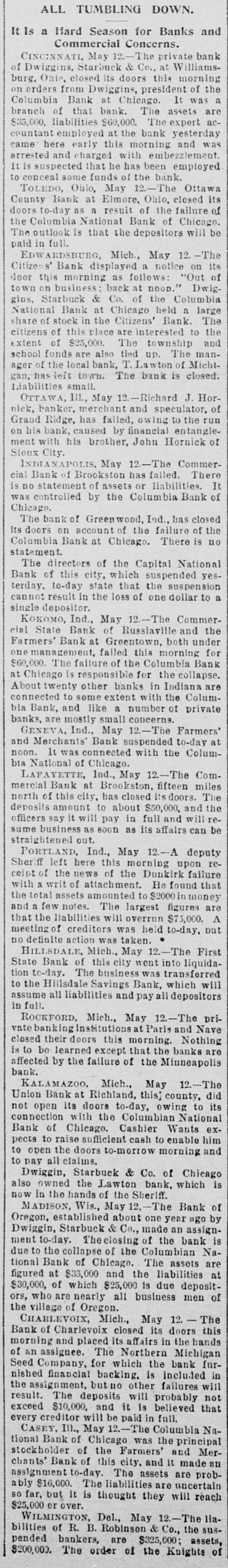 ALL TUMBLING It Is a Hard Season for Banks and Commercial Concerns. CINCINNATI, May -The private bank Dwiggins, Starbuck & Co., at Williamsof Ohio, closed its doors this morning of the burg. orders from Dwiggins, president a on Columbia Bank at Chicago. It was branch of that bank. The assets are $35,000, liabilities $60,000. The expert accountant employed at the bank yesterday was here early this morning and came arrested and charged with embezzlement. It is suspected that he has been employed to conceal some funds of the bank. TOLEDO, Ohio, May -The Ottawa its Bank at Elmore, Ohio, closed of doors County to-day as a result of the failure Columbia National Bank of Chicago. be the The outlook is that the depositors will paid in full. EDWARDSBURG, Mich., May 12.-The its Citizens' Bank displayed a notice on this morning as follows: "Out Dwig- of door on business; back at nood." Columbia town Starbuck & Co. of the large gios. Bank at Chicago held a The share National of stock in the Citizens' Bank. citizens of this place are interested to and the extent of $25,000. The township The manschool funds are also tied up. Michtof the local bank, T. Lawton of gan. ager has left town. The bank is closed. Liabilities small. OTTAWA, III., May Richard J. Hor- of ranker, merchant and speculator. Grand nick, Ridge, has failed, owing to the run his bank, caused by financial entangle- of on ment with his brother, John Hornick Sioux City. INDIANAPOLIS. May 12.-The Commer- There Bank of Brookston has failed. It cial statement of assets or liabilities. is was no controlled by the Columbia Bank of Chicago. The bank of Greenwood, Ind., has closed the doors on account of the failure of its Columbia Bank at Chicago. There is no statement. The directors of the Capital National Bank of this city, which suspended yesterday, to-day state that the suspension to a cannot result in the loss of one dollar single depositor. KOKOMO, Ind., May 12.-The Commer- the State Bank of Russiaville and cial Farmers' Bank Greentown, both under management, failed this morning Bank for $60,000. one The failure of the Columbia Chicago is responsible for the collapse. at About twenty other banks in Indiana are connected to some extent with the private Columbia Bank, and like a number of banks, are mostly small concerns. GENEVA. Ind., May 12.-The Farmers' at Merchants Bank suspended to-day noon. and It was connected with the Columbia National of Chicago. LAFAYETTE, Ind., May 12.-The miles ComBank at Brookston. fifteen The mercial north of this city, has closed its doors. deposits amount to about $50,000, and the reofficers say it will pay in full and will be sume business as soon as its affairs can straightened out. PORTLAND, Ind., May 12.-A deputy Sheriff left here this morning upon receipt of the news of the Dunkirk failure that with a writ of attachment. He found total assets amounted to $2000 in money are the and a few notes. The largest figures that the liabilities will overrun $75,000. A meeting of creditors was held to-day, out no definite action was taken. HILLSDALE, Mich., May 12.-The First State Bank of this city went into liquidation tc-day. The business was transferred will the Hillsdale Savings Bank, which in full. to assume all liabilities and pay all depositors ROCKFORD, Mich., May 12.-The Nave private banking Institutions: at Paris and closed their doors this morning. Nothing to be learned except that the banks are affected is by the failure of the Minneapolis bank. KALAMAZOO. Mich., May 12.-The did Union Bank at Richland, this county, its doors to-day, owing to its connection not open with the Columbian National Bank of Chicago. Cashier Wants exto raise sufficient cash to enable him and to pects open the doors to-morrow morning to pay all claims. Dwiggin, Starbuck & Co. of Chicago is also owned the Lawton bank, which now in the hands of the Sheriff. MADISON, Wis., May 12.-The Bank by of Oregon. established about one year ago Dwiggin, Starbuck & Co., made an assignment to-day. The closing of the bank Na- is due to the collapse of the Columbian tional Bank of Chicago. The assets are at figured at $35,000 and the liabilities $30,000, of which $25,000 is due deposit- of ors, who are nearly all business men the village of Oregon. CHARLEVOIX, Mich., May 12. - The this Bank of Charlevoix closed its doors morning and placed its affairs in the hands of an assignee. The Northern Michigan Seed Company, for which the bank furnished financial backing. is included in the assignment, butno other failures will not result. The deposits will probably that exceed $10,000, and it is believed every creditor will be paid in full. CASEY, III., May -The Columbia National Bank of Chicago was the principal stockholder of the Farmers' and Merchants' Bank of this city. and it made an assignment to-day. The assets are probably $16,000. The liabilities are uncertain so far, but it is thought they will reach $25,000 or over. WILMINGTON, Del., May 12.-The liabilities of R. B. Robinson & Co., the suspended bankers, are $325,000; assets, of $200,000. The order of the Knights