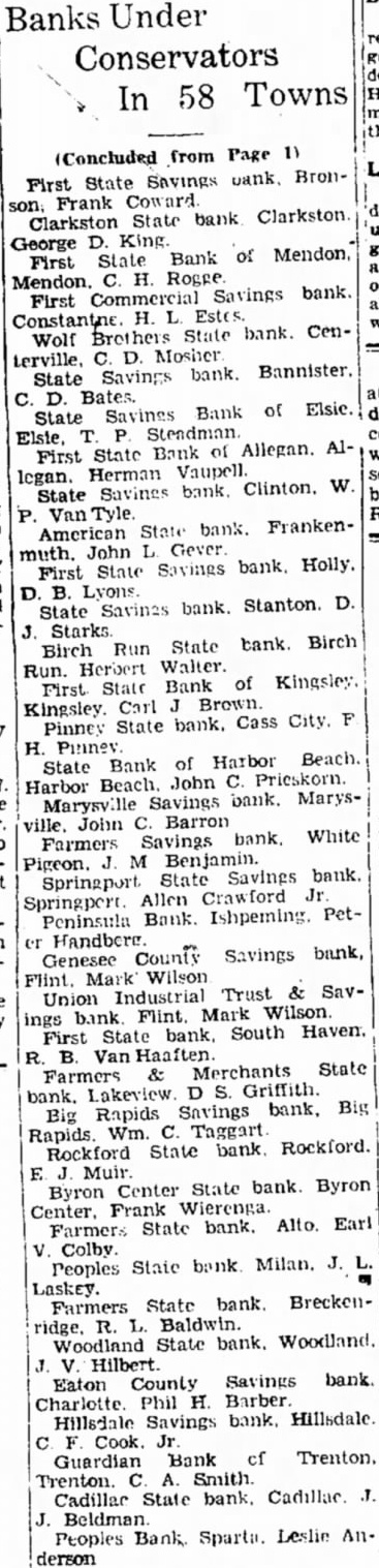Banks Under Conservators In 58 Towns (Concluded from Page 1) First State SAVINGS bank. Bronson, Frank Coward Clarkston State bank Clarkston. D. King George First State Bank of Mendon, C. H. Rogge Mendon. First Commercial Savings bank Wolf Brothers State bank. Centerville, C. D. Mosher State Savings bank. Bannister. C. D. Bates. State Savings Bank of Elsic. First State Bank of Allegan. Allegan. Herman Vaupell State Savines bank. Clinton. W. P. Van Tyle. American State bank. Frankenmuth. John L Gever First State Savings bank. Holly. B. State Savinas bank. Stanton D. Birch Starks Run State bank. Birch Run. Herbert Walter. First State Bank of Kingsley. Kingsley. Carl J Brown Pinney State bank. Cass City. F State Punney Bank of Harbor Beach. Harbor Beach John C. Prieskorn. Marysville Savings bank. Marysville. John C. Barron Farmers Savings bank. White Pigeon. J. M Benjamin. Springport State Savings bank. Springpert. Allen Crawford Jr Peninsula Bank. Ishpeming. PetGenesee County Savings bank, Flint. Mark Wilson Union Industrial Trust & Savings bank Flint. Mark Wilson First State bank, South Haven. R. B. Van Haaften Farmers & Merchants State bank. Lakeview D S. Griffith. Big Rapids Savings bank. Big Rapids. Wm. C. Taggart Rockford State bank. Rockford. E J. Muir Byron Center State bank. Byron Center. Frank Wierenga. Farmers State bank. Alto. Earl V. Colby. Peoples State bank Milan. J. Laskey. Farmers State bank. Breckenridge. R. L. Baldwin. Woodland State bank. Woodland. J. V. Hilbert Eaton County Savings bank Charlotte Phil H. Barber Hillsdale Savings bank. Hillsdale C F. Cook. Jr. Guardian Bank cf Trenton. Trenton. C. A. Smith Cadillac State bank. Cadillac J. J. Beldman Peoples Bank Sparts. Leslie Anderson
