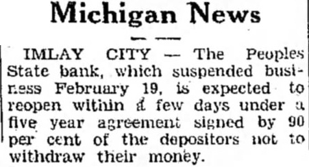 Michigan IMLAY CITY Peoples State bank, which suspended ness February 19, expected reopen within few days under five year agreement signed by cent the depositors not withdraw their money.