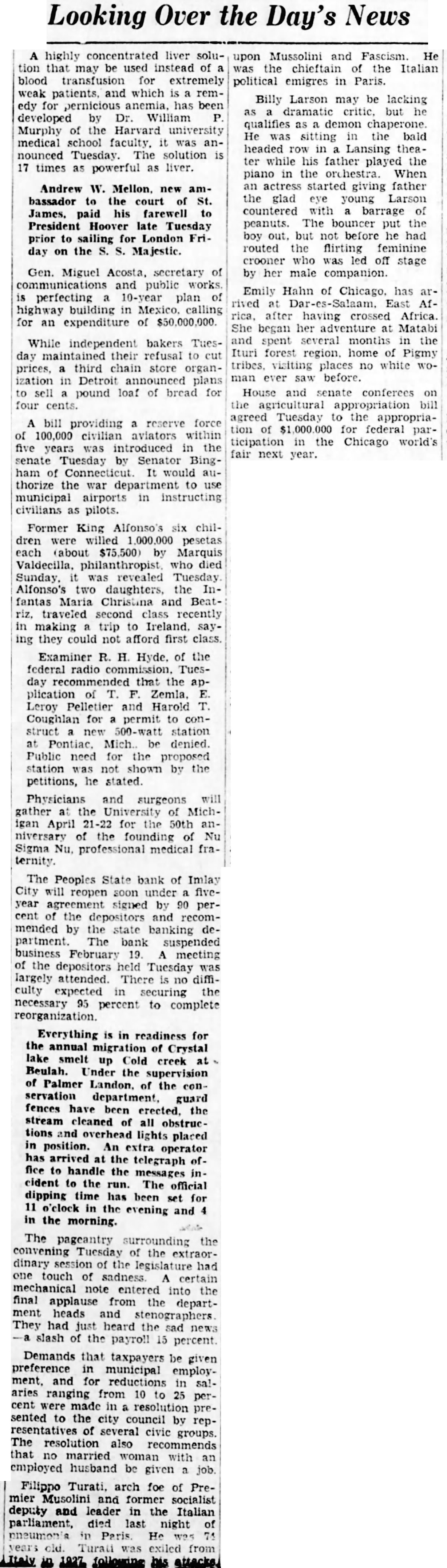Looking Over the Day's News A highly concentrated liver solution that may be used instead of a blood transfusion for extremely weak patients, and which is a remedy for pernicious anemia, has been developed by Dr. William Murphy of the Harvard university medical school faculty. it was announced Tuesday. The solution is 17 times as powerful as liver. Andrew W. Mellon. new ambassador to the court of St. James, paid his farewell to President Hoover late Tuesday prior to sailing for London Friday on the S. S. Majestic. Gen. Miguel Acosta, secretary of communications and public works. is perfecting a 10-year plan of highway building in Mexico. calling for an expenditure of $50,000,000 While independent bakers Tuesday maintained their refusal to cut prices, a third chain store organization in Detroit announced plans to sell a pound loaf of bread for four cents. A bill providing a reserve force of 100,000 civilian aviators within five years was introduced in the senate Tuesday by Senator Bingham of Connecticut. It would authorize the war department to use municipal airports in instructing civilians as pilots. Former King Alfonso's six children were willed 1,000,000 pesetas each (about $75,500) by Marquis Valdecilla, philanthropist who died Sunday, it was revealed Tuesday Alfonso's two daughters, the Infantas Maria Christina and Beatriz, traveled second class recently in making a trip to Ireland. saying they could not afford first class. Examiner R. H. Hyde. of the federal radio commission. Tuesday recommended that the application of T. F. Zemla. E. Leroy Pelletier and Harold T. Coughlan for permit to construct new 500-watt station at Pontiac, Mich. be denied. Public need for the proposed station was not shown by the petitions, he stated. Physicians and surgeons will gather at the University of Michigan April 21-22 for the 50th anniversary of the founding of Nu Sigma Nu. professional medical fraternity. The Peoples State bank of Imlay City will reopen soon under a fiveyear agreement signed by 90 percent of the depositors and recommended by the state banking department. The bank suspended business February 19 A meeting of the depositors held Tuesday was largely attended. There is no difficulty expected in securing the necessary 95 percent to complete reorganization. Everything is in readiness for the annual migration of Crystal lake smelt up Cold creek at Beulah. Under the supervision of Palmer Landon, of the conservation department. guard fences have been erected. the stream cleaned of all obstructions and overhead lights placed in position. An extra operator has arrived at the telegraph office to handle the messages incident to the run. The official dipping time has been set for 11 o'clock in the evening and 4 in the morning. The pageantry surrounding the convening Tuesday of the extraordinary session of the legislature had one touch of sadness A certain mechanical note entered into the final applause from the department heads and stenographers They had just heard the sad news slash of the payroll 15 percent Demands that taxpayers be given preference in municipal employment. and for reductions in salaries ranging from 10 to 25 percent were made in resolution presented to the city council by representatives of several civic groups. The resolution also recommends that no married woman with an employed husband be given a job. Filippo Turati, arch foe of Premier Musolini and former socialist deputy and leader in the Italian parliament, died last night of pneumont in Paris He was 74 years old. Turati was exiled from Italy in 1927 following his attacks upon Mussolini and Fascism. He was the chieftain of the Italian political emigres in Paris. Billy Larson may be lacking as dramatic critic, but he qualifies as demon chaperone He sitting in the bald headed row in Lansing theater while his father played the piano in the orchestra. When an actress started giving father the glad eye young Larson countered with barrage of peanuts. The bouncer put the boy out, but not before he had routed the flirting feminine crooner who was led off stage by her male companion. Emily Hahn of Chicago, has arrived at Dar-es-Salaam. East Africa, after having crossed Africa She began her adventure at Matabi and spent several months in the Ituri forest region. home of Pigmy tribes, visiting places no white woman ever saw before. House and senate conferees on the agricultural appropriation bill agreed Tuesday to the appropriation of $1,000.000 for federal participation in the Chicago world's fair next year.
