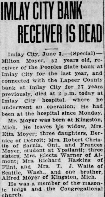 BANK RECEIVER IS DEAD Imlay City, June 3.-(Special) Milton Moyer, 52 years old, receiver of the Peoples State bank at Imlay City for the last year, and connected with the Lapeer County bank at Imlay City for 27 years previously, died at p.m. today at Imlay City hospital, where he underwent an operation. He had been at the hospital since Monday. Mr. Moyer was born at Kingston, Mich. He leaves his widow, Mrs. Etta Moyer; three daughters, Bernice of Detroit; Mrs. Robert Christie of Sarnia, Ont., Frances Moyer, student at Ypsilanti; three sisters, Electa Warner of Almont; Mrs. Richard Haskins Flint, and Mrs. T. J. Waite of Seattle Wash. and one brother, Alfred Moyer of Kingston, Mich. He member the masonic lodge and the Congregational church.