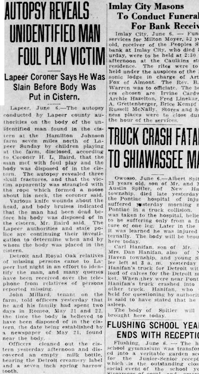 Imlay City Masons AUTOPSY REVEALS To Conduct Funeral For Bank Receiver UNIDENTIFIED MAN Imlay City, June Funeral services for Milton Moyer, 52 years old, receiver of the Peoples State bank at Imlay City, who died SatFOUL PLAY VICTIM urday, were to be held at 2:30 this afternoon the Caulkins street residence. The rites were to be Lapeer Coroner Says He Was sonic lodge charge of Arthur Fox of Almont The Rev. B. A Slain Before Body Was Warren was to officiate The bearers chosen are Irvine Cardwell Put in Cistern. Lapeer, June autopsy Russell McNally. Stores and busiconducted by Lapeer county au- ness places to close during the hour of the thorities on the body of the unidentified man found in the cistern at the Hamilton Johnson TRUCK CRASH FATAL farm seven miles north of Lapeer Sunday by children playing at the farm, disclosed according to Coroner H. L. Baird, that the TO SHIAWASSEE MAN man met with foul play and the body was disposed of in the cistern. The autopsy three skull fractures. and that the vic23 years old. son of Mr. and tim apparently was strangled with Austin New the rope which formed noose died late yesterday about his neck, the coroner said. the Pontiac hospital of injuries Various knife wounds about the suffered yesterday morning near head, and body bruises indicated Pontiac in truck collision He that the man had been dead bewas to the hospital, believed fore his body was disposed of in to be suffering from a fracthe cistern, Mr. Baird said. The ture of one leg. Later in the day Lapeer authorities and state poit was learned he was injured inare continuing their investiternally. The body will be brought gation to determine when and by here today. whom the body was placed in the Carl Hanifan. son of Mr. and Mrs. Dan Hanifan, also of New Detroit and Royal Oak relatives and young Spitof missing came to La ler left at yesterday last night in an effort to idenHanifan's truck for Detroit with tify the man, and many queries load of calves for the Detroit marhave been received over the tele- ket. When they Pontiac phone from relatives of persons Hanifan's truck crashed into anreported missing other truck. Hanifan, who John Millard tenant on the held for questioning by authorities farm, told officers yesterday that is said to have stated that he fell he and his family had spent two asleep. days in Romeo, May and 22. The body of Spitler will be the time the body is believed to brought here today been disposed of the cisFLUSHING SCHOOL YEAR tern the being established by newspaper of May 21. found ENDS WITH RECEPTION near the body Officers cleaned out the cis- Flushing. June The high tern afternoon and dis- school gymnasium was transform ed into veritable garden scene covered an empty milk bottle. for bearing the Detroit creamery label which outstanding closing and seven inch spring harrow social of the tooth.