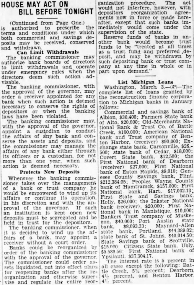 HOUSE MAY ACT ON BILL BEFORE TONIGHT (Continued from Page One.) authorized prescribe the terms and conditions under which both commercial and savings posits may be received, conserved and withdrawn. Can Limit Withdrawals The banking commissioner may authorize boards of directors limit withdrawals and operate under emergency rules when the directors deem such action advisable. The banking commissioner. with the approval of the governor. may order receiver appointed for any bank when such action is deemed necessary to conserve the rights depositors or when banking laws have been violated. banking with the of the ganization procedure. The act would interfere, with depositors agreements now in force or made hereafter. except that such banks immediately would come under the supervision the state. Reserve funds of banks in another bank would become trust funds to "treated at all times trust fund and preferred posit, may withdrawn such bank or trust pany at any in whole or in part upon List Michigan Loans Washington, March complete list of loans granted by the finance corporation to Michigan banks in January follows: Commercial and savings bank of Albion, Farmers State of Alto. $20,000; Old Bank Trust Co. of Battle tional bank and Trust company of Benton Harbor, (receiver) $90,000; change state bank. Carsonville. state bank of Cedar $18,000; 500; State the Covert National bank of Dearborn First First National (receiver) bank of Eaton Rapids, $9,010: Genesee County Savings bank, Peoples County bank of National bank. Hart, First State and Savings bank. Holly, $26,000: the Inkster National bank (receiver) $20,000 First National bank in Manistique $10,000: Bankers Trust company of MuskePort Austin state gon. state bank. Portland. state bank of St. State Savings bank Scottville Citizens State bank Ubly National bank of interest rate percent in The all cases except the following BatCreek and Benton Harbor percent.