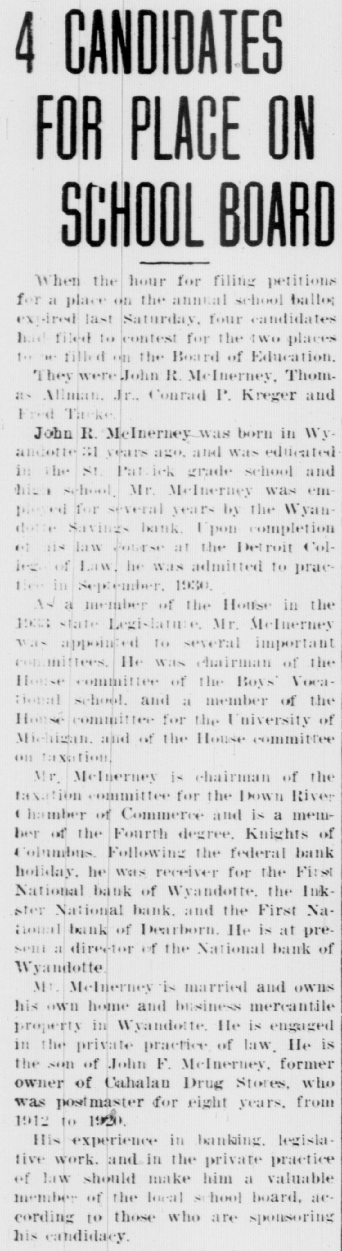 4 CANDIDATES FOR PLACE ON SCHOOL BOARD When the hour for filing petitions for a place on the annual school ballot expired last Saturday, four candidates had filed to contest for the two places 1.1 De filled on the Board of Education. They were John R. McInerney, Thomas Allmian, Jr., Conrad P. Kreger and Fred Tacke John R. McInerney-was born in Wy. andotte 31 years ago, and was educated in the St. Pattick grade school and thisn school. Mr. MeInerney was employed for séveral years by the Wyandotte Savings bank. Upon completion et iis law Jourse at the Detroit Colleg. of Law. he was admitted to practier in September, 1930. As a member of the Houtse in the 1933 state Legislature. Mr. McInerney was appointed to several important committees. He Wils chairman of the House committee of the Boys' Vocational school. and a member of the House committee for the University of Michigan. and of the House committee on taxation Mr. Melnerney is chairman of the taxation committee for the Down River 1 hamber of Commerce and is a member of the Fourth degree, Knights of Columbus. Following the federal bank holiday, he was receiver for the First National bank of Wyandotte, the Inkster National bank. and the First NaHomal bank of Dearborn. He is at present a director of the National bank of Wyandotte. Mr. Melnerney is married and owns his own home and business mercantile property in Wyandotte. He is engaged in the private practice of law. He is the son of John F. McInerney, former owner of Cahalan Drug Stores, who was postmaster for eight years. from 1912 to 1920. His experience in banking. legislative work. and in the private practice of law should make him a valuable member of the local school board. according to those who are sponsoring his candidacy.