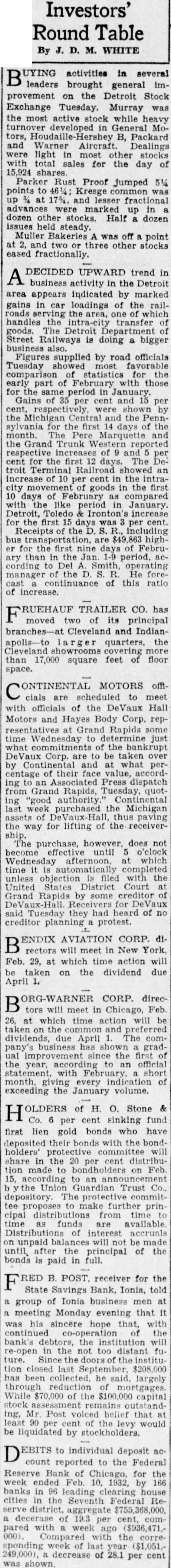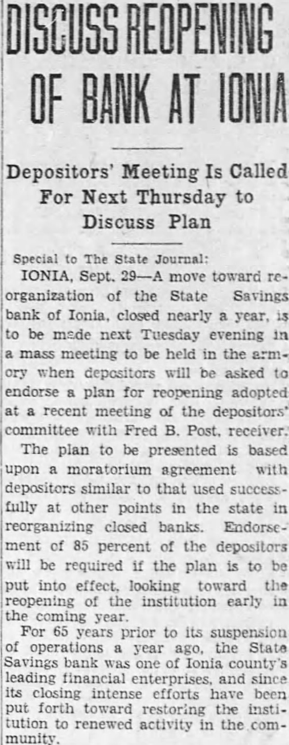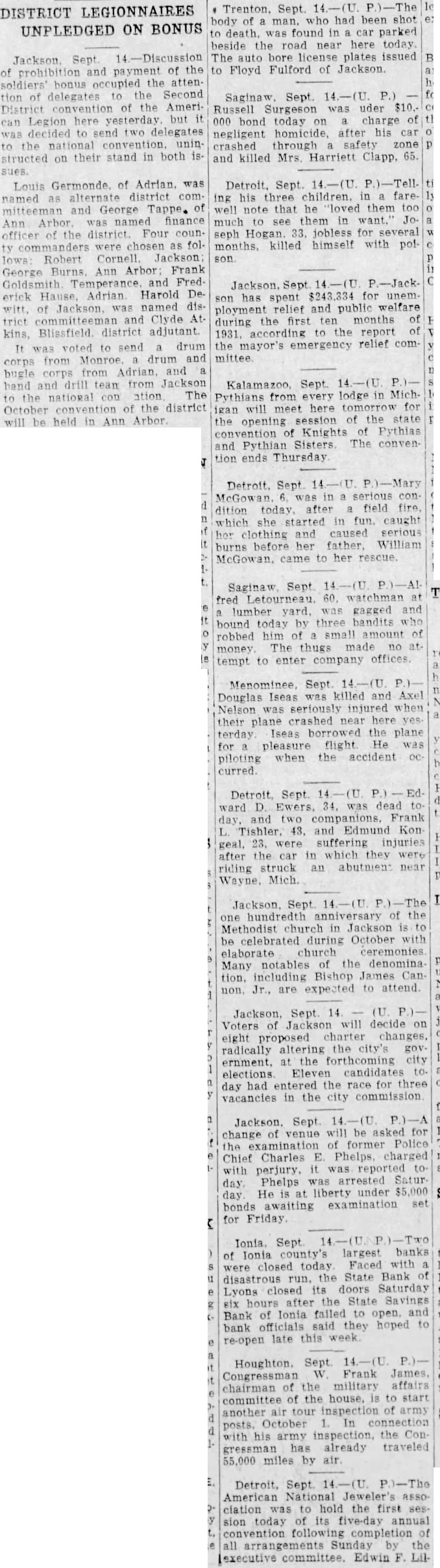 DISTRICT LEGIONNAIRES UNPLEDGED ON BONUS Trenton. Sept. body of man. who had been shot to death. was found in car parked beside the road near here today The auto bore license plates issued Sept. of prohibition and payment of the to Floyd Fulford of Jackson. soldiers bonus occupied the attention of delegates the Second Saginaw, Sept. 14.-(U. P.) District convention of the Ameri- Russell Surgeson was uder $10.can Legion here yesterday. but 000 bond today on charge of decided send delegates negligent homicide, after his car the national convention. unin- crashed through safety zone structed on their stand in both is and killed Mrs Harriett Clapp. 65. Louis Germonde, of Adrian. was named as alternate district com- ing his three children. faremitteeman and George Tappe. of well note that he loved them too Ann Arbor was named finance much to see them in want.' Jo. officer of the district. Four coun- seph Hogan. 33. jobless for several were as fol- months, killed himself with pollows: Robert Cornell. Jackson: George Burns, Ann Arbor: Frank erick Hause, Adrian Harold De- son has spent $243,334 for unemwitt, of Jackson. was named dis- ployment relief and public welfare committeeman and Clyde At- during the first ten months of kins, Blissfield. district adjutant. 1931. according to the report of It was voted to send drum the mayor's emergency relief com corps from Monroe drum and mittee bugle corps from Adrian, and hand and drill team from Jackson national The Pythians from every lodge in Michto the convention of the district igan will meet here tomorrow for October will be held in Ann Arbor the opening session of the state convention of Knights of Pythias Pythian The and tion ends Thursday Detroit. Sept McGowan. in serious condition today after field fire, which she started in fun. caught her clothing and caused serious burns before her father, William McGowan, came to her rescue. fred Letourneau. 60. watchman at lumber yard. was gagged and bound today by three bandits robbed him of small amount of money The thugs made at. tempt to enter company offices. Menominee Sept Douglas Iseas was killed and Axel Nelson was seriously injured when their plane crashed near here yes terday Iseas borrowed the plane for pleasure flight He was piloting when the accident OCcurred. ward Ewers. 34, was dead to day and two companions, Frank Tishler. 43, and Edmund Kon geal. 23. were suffering injuries after the car in which they were riding struck an abutnient near Wayne. Mich. hundredth anniversary of the Methodist church in Jackson to be celebrated during October with elaborate church ceremonies Many notables of the denomina tion, including Bishop James Cannon. Jr., are expected to attend. Jackson, Sept 14 (U Voters of Jackson will decide on eight proposed charter changes. radically altering the city's gov ernment. at the forthcoming city elections Eleven candidates to. day had entered the race for three vacancies in the city commission change of venue will be asked the examination of former Police Chief Charles Phelps. charged with perjury. reported He at liberty under $5,000 bonds awaiting examination set for Friday. Sept of Ionia county's largest banks were closed today Faced with run. the State Bank of Lyons closed its doors Saturday six hours after the State Savings Bank of Ionia failed to open. and bank officials said they hoped to re-open late this week Houghton. Sept Congressman Frank James. chairman of the military affairs committee of the house, is to start another tour inspection of army posts, October In connection with his army inspection, the Congressman has already traveled 55,000 miles by air. American National ASSO ciation was to hold the first ses sion today of its five-day annual convention completion of arrangements by the (executive committee. Edwin Lil-