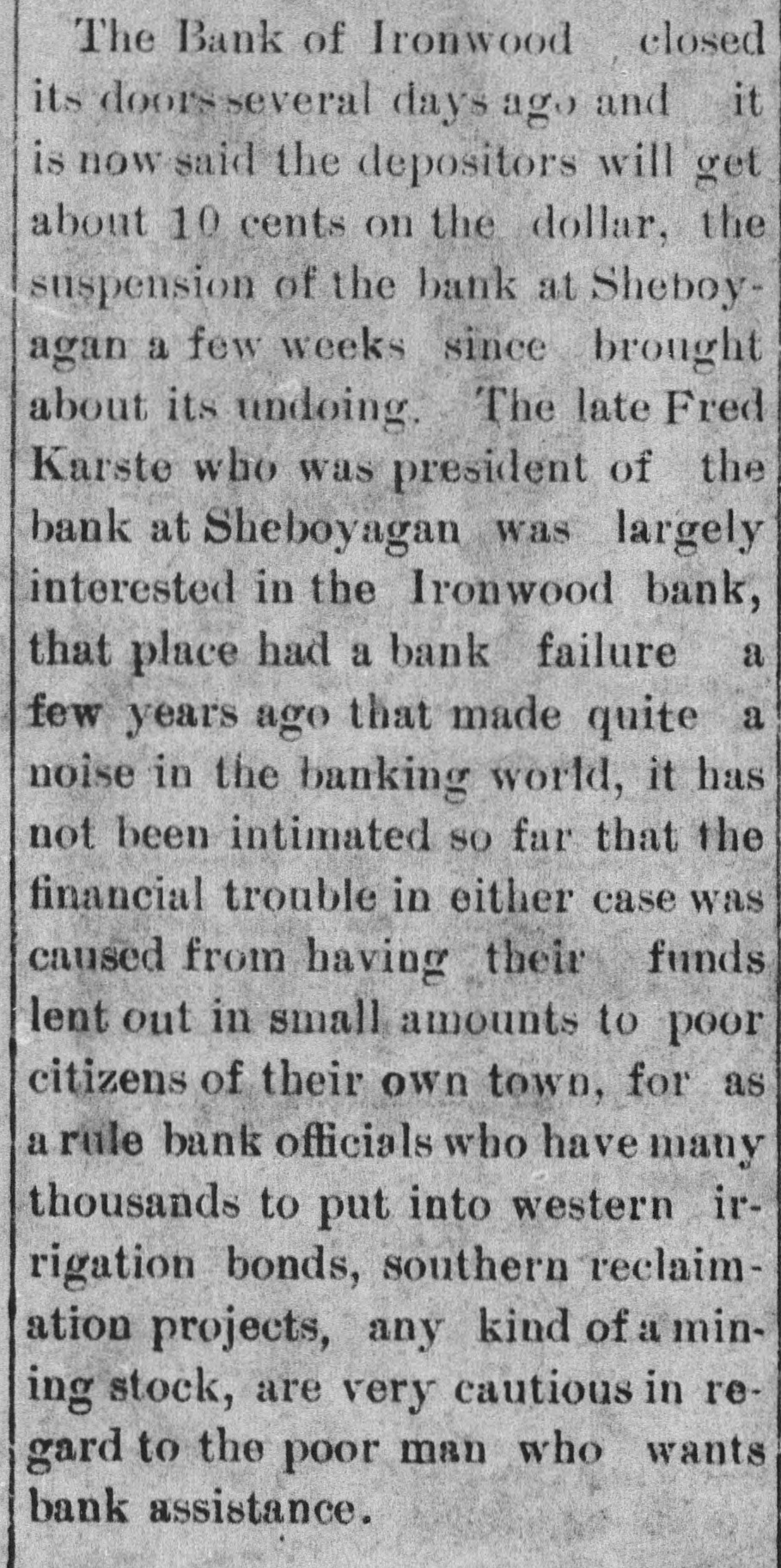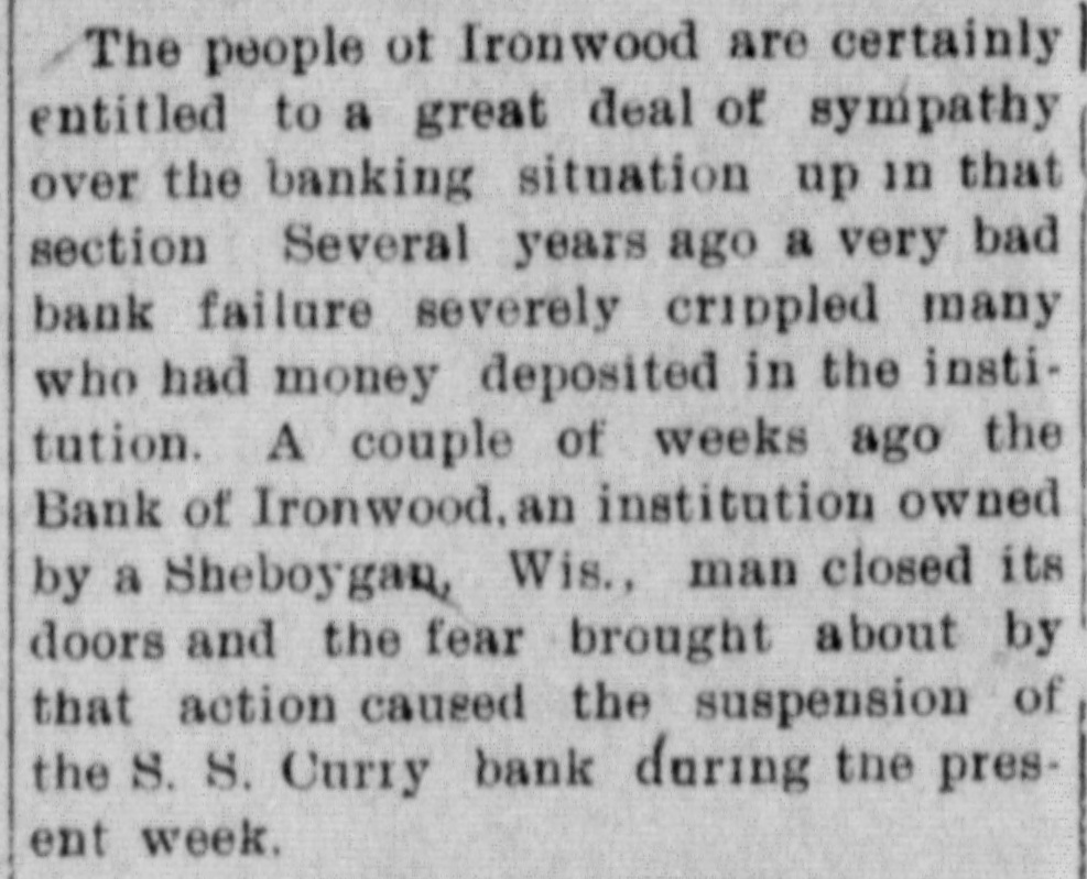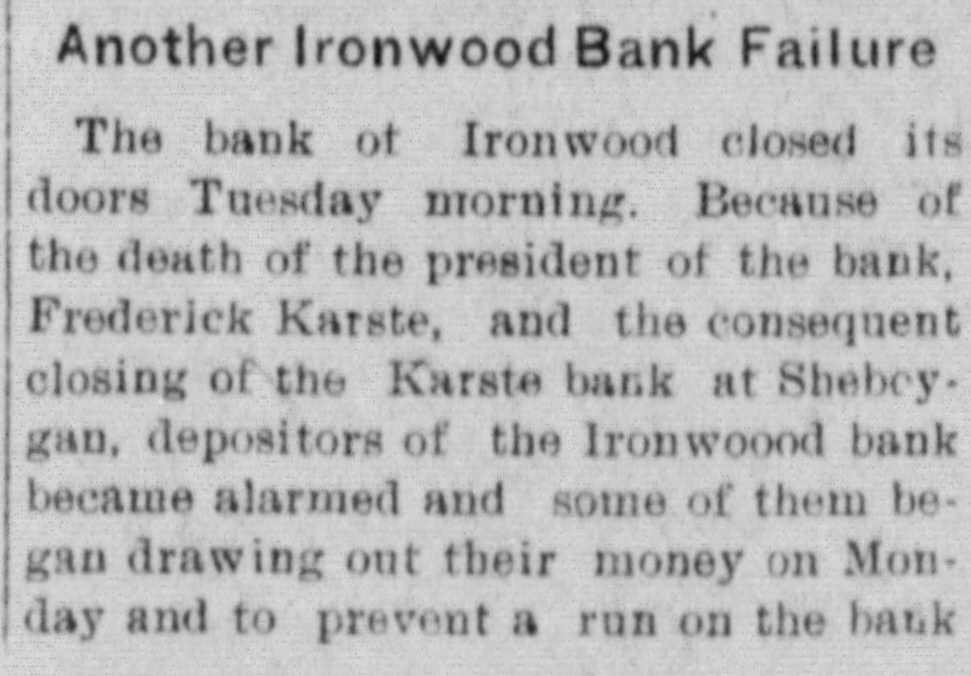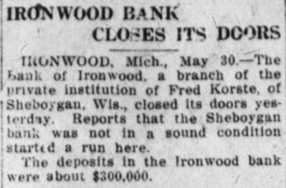The Peoples Banking company of this city closed its doors Wednesday morning, when a notice to this effect was posted on the windows of the bank. As a result of the closing of the Bank of Ironwood, there was run on the Peoples Bank, necessitating its