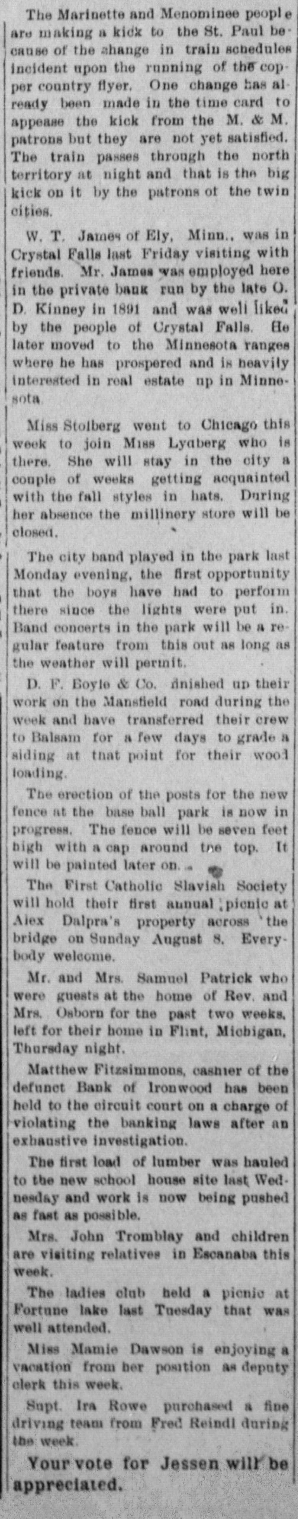 John Hoenski, the policeman who shot and killed Finn at Bessemer last week has been asked to resign by city officials, although it was clear case of shooting in self defense. financial circles on Mercantile and greatly surprised the were range Thursday morning by the announcement that F. D. Day & Co., of Hurley, had made an assignment for the benefit of its creditors.
