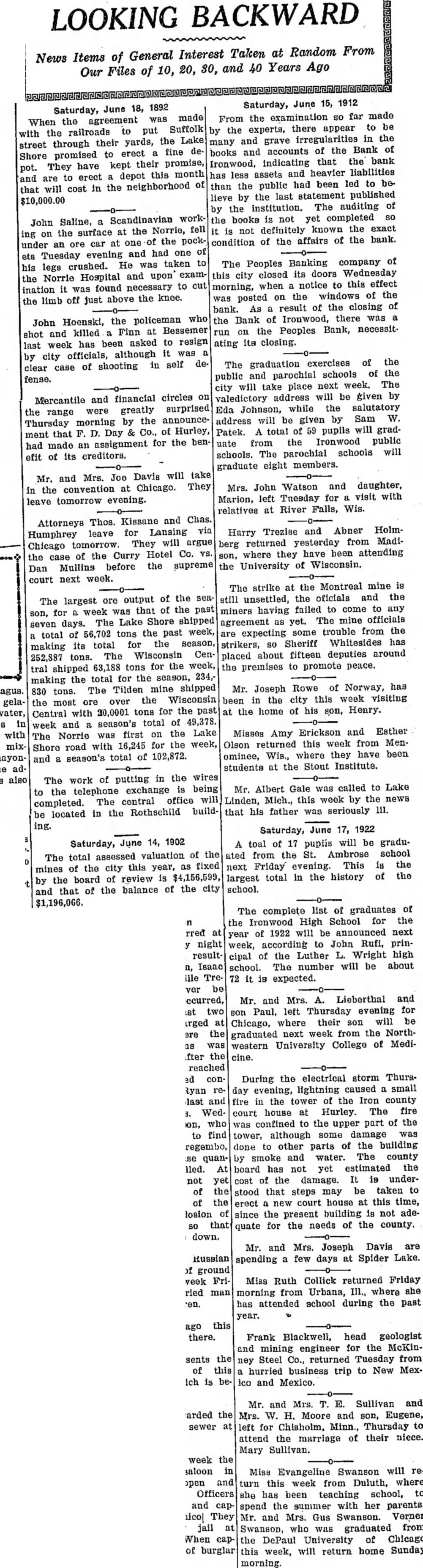 The graduation exercises of the public and parochial schools of the city will take place next week. The valedictory address will be given by Eda Johnson, while the salutatory address will be given by Sam W. Patek. A total of 59 pupils will graduate from the Ironwood public schools. The parochial schools will graduate eight members.